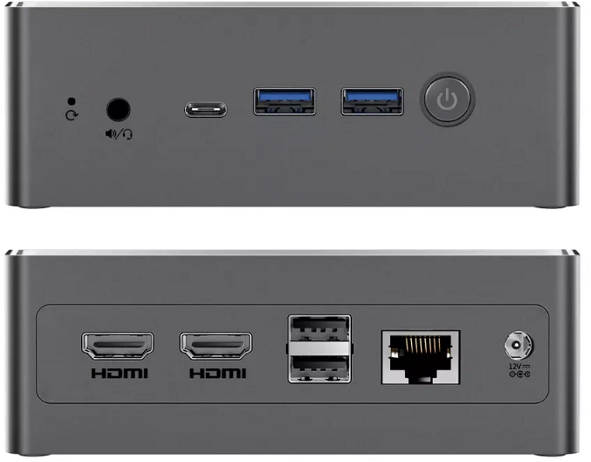 De Bmax B4 Turbo Mini PC is ontworpen om onopvallend en efficiënt te zijn. De behuizing is “slechts enkele centimeters” hoog en diep, waardoor hij netjes op of onder een monitor past en op een klein bureau nauwelijks plek inneemt. Het ultracompacte formaat helpt ook om kabels overzichtelijk te houden: twee HDMI‑uitgangen, een Type‑C‑poort, vier USB 3.0‑poorten, gigabit‑lan en een 3,5 mm audio‑jack zitten overzichtelijk gegroepeerd. Zo kun je eenvoudig je randapparatuur, toetsenbord, muis, webcam en extra scherm(en) kwijt zonder naar een aparte hub te hoeven grijpen.