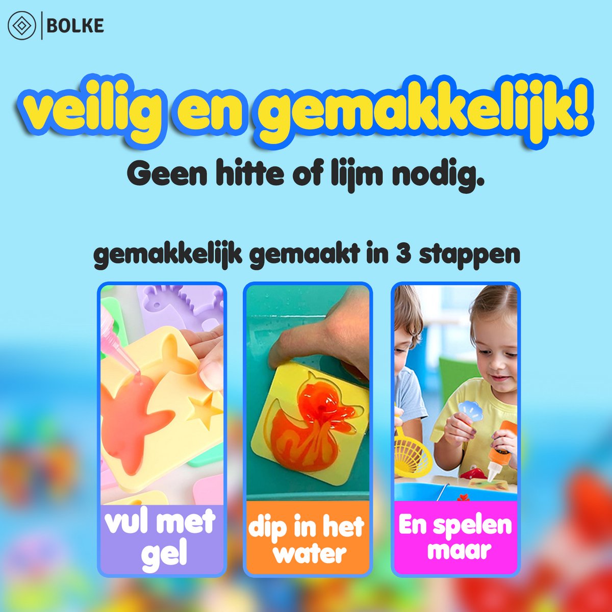 De set is opgebouwd rondom drie kernonderdelen: gel-flesjes in uiteenlopende kleuren en effecten, herbruikbare vormen om de gel in te gieten, en een doorzichtig waterbakje om het vormproces te zien gebeuren. De vormen zijn van soepel materiaal en bedoeld om vaak opnieuw te gebruiken. Dat is praktisch voor gezinnen: je hebt niet voor elk figuur een wegwerpmal nodig, maar bouwt een vaste collectie die je steeds anders kunt inzetten.
