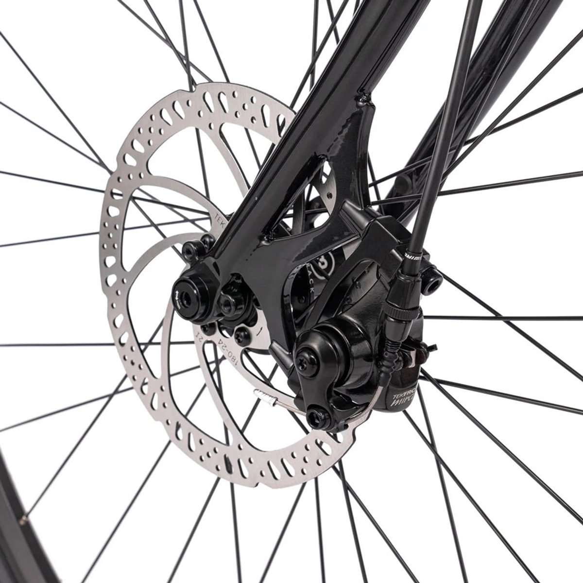 De Arise barst van de montageopties: voor- en achterdrager, spatborden, meerdere bidonhouders en bevestigingspunten op de vork. De voorvork heeft bovendien geleiding voor een dynamokabel, handig als je een naafdynamo wilt gebruiken voor vaste verlichting of het laden van elektronica. In het dagelijks leven betekent dit: spatborden erop en je blijft droog; in het weekend: tassen en dragers monteren en je bent klaar voor een nachtje buiten. Deze flexibiliteit maakt de fiets tot een echte alleskunner.