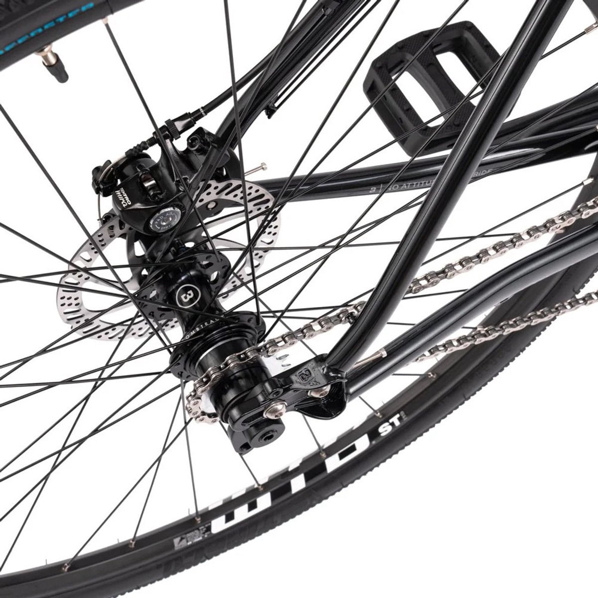 De Bombtrack Arise is geen racemonster, maar een nuchtere avonturier. De enkelvoudige overbrenging (42 x 16) is ideaal voor vlak tot glooiend terrein en bewijst zijn waarde in regen en modder waar eenvoud wint. De combinatie van staal, brede banden en sterke wielen geeft rust en grip, terwijl de geometrie uitnodigt tot lange dagen in het zadel.