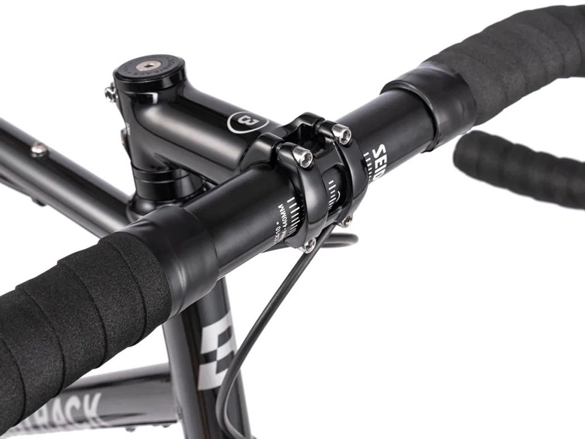 Een licht uitlopend racestuur geeft extra hefboom en controle in grindbochten en op ruwe ondergrond. Met 10° flare houd je een comfortabele bovenkant voor lange rechte stukken, en extra stabiliteit in de beugels als het pad los of hobbelig wordt. In combinatie met het stalen frame draagt dit bij aan een zeker en ontspannen stuurgevoel.