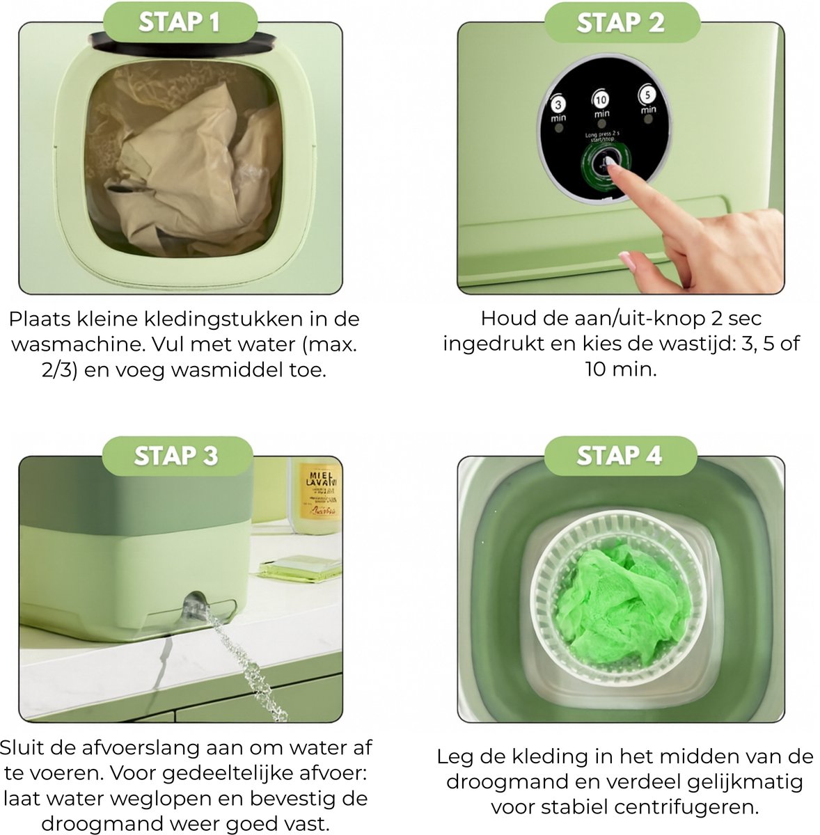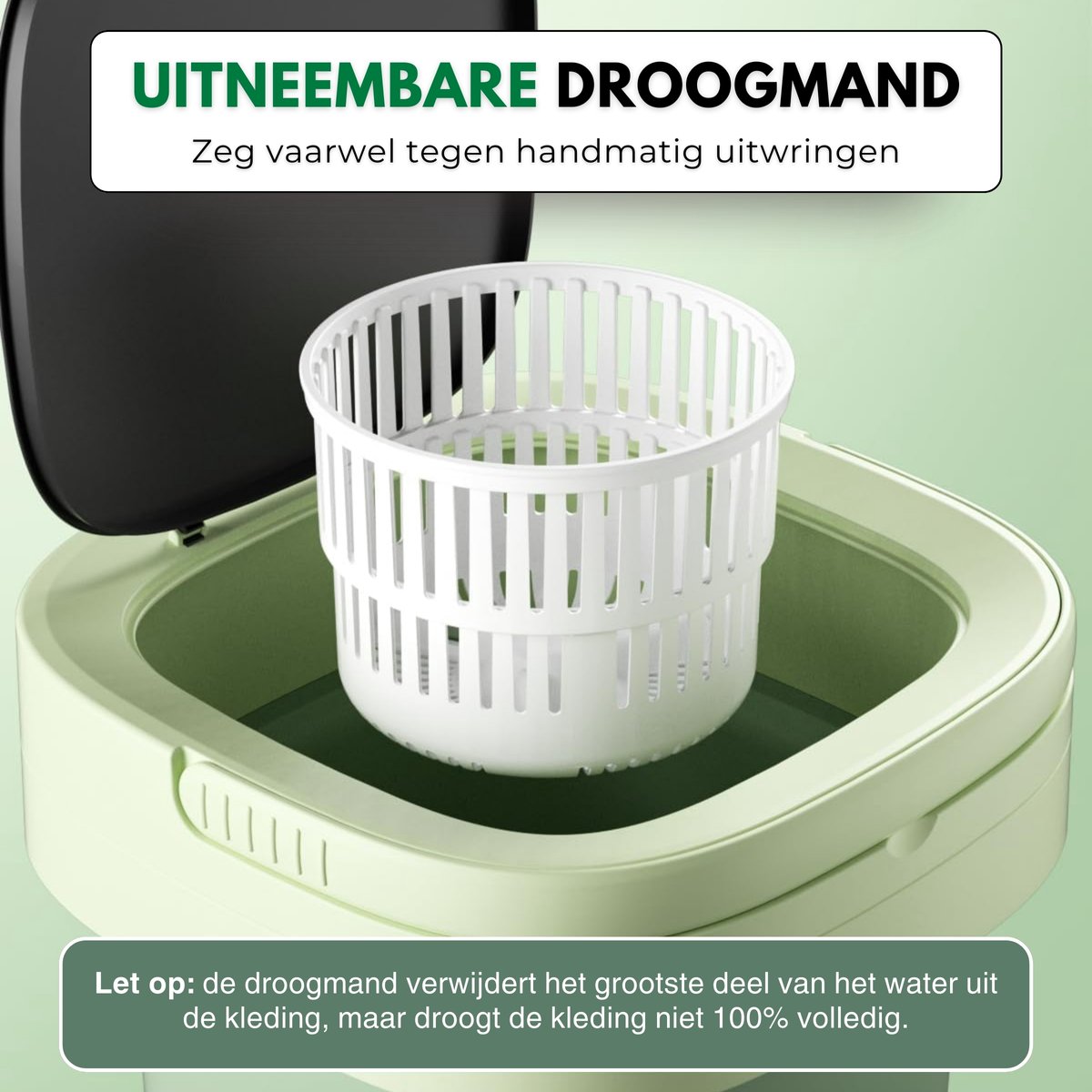 Voor wie is dit? Voor iedereen die weinig ruimte heeft, buiten de deur wil kunnen wassen of een praktische tweede wasoptie zoekt. Studenten, jonge ouders, tiny house-bewoners, kampeerders en mensen die vaak sportkleding wassen profiteren van de eenvoud en het gemak. De uitneembare droogmand helpt het meeste water uit de was te verwijderen, zodat het droogproces sneller gaat en je kleding minder lang hoeft te hangen.
