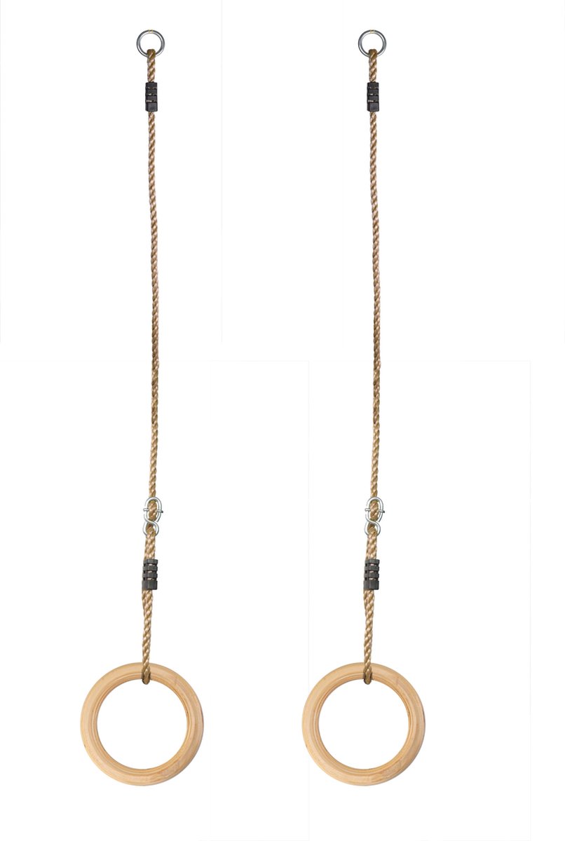 De bouw is simpel en doelgericht: houten ringen met robuuste bevestigingspunten die je snel kunt ophangen en aanpassen. Geschikt voor kinderen en recreatieve volwassenen die willen werken aan upper-body kracht, motoriek en balans.