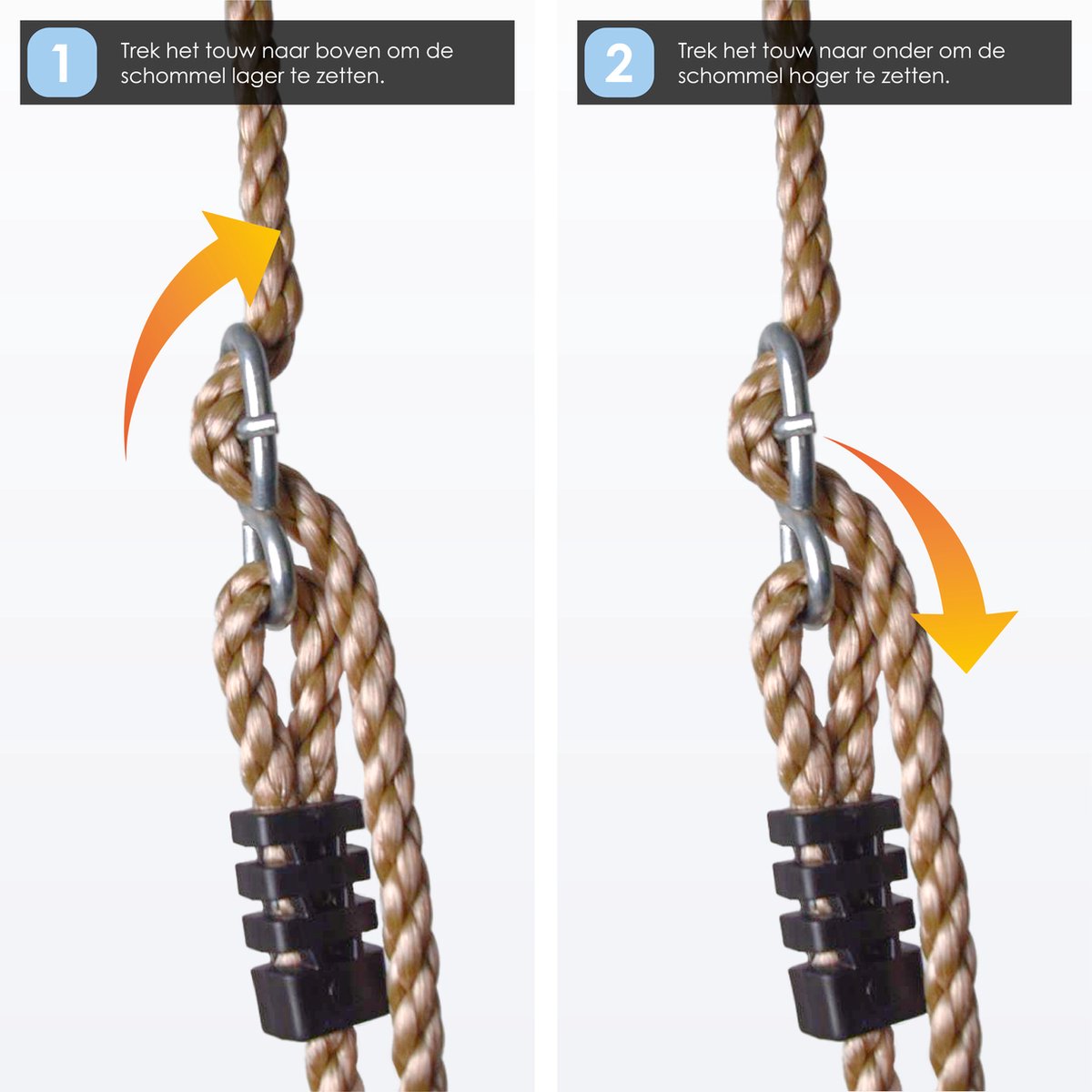 De metalen onderdelen (ophangringen en stelachten) zijn gegalvaniseerd, wat bescherming biedt tegen roest bij buitengebruik. De touwverbindingen gebruiken zwarte PP kunststof lassen — kunststof lasnaden kunnen slijtagepunten zijn, dus regelmatig inspecteren is verstandig.