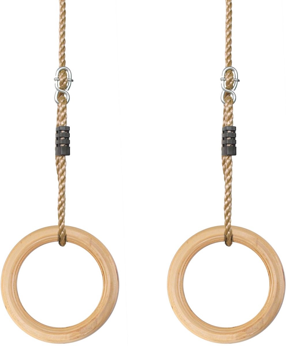 Overzicht:turnringen voor actief buitenspelen, ideaal voor Nederlandse gezinnen die motoriek willen bevorderen. Gemaakt van gevernist multiplex met afmetingen 14,5 x 2,5 cm en verstelbare touwen voor uiteenlopende hoogtes.
