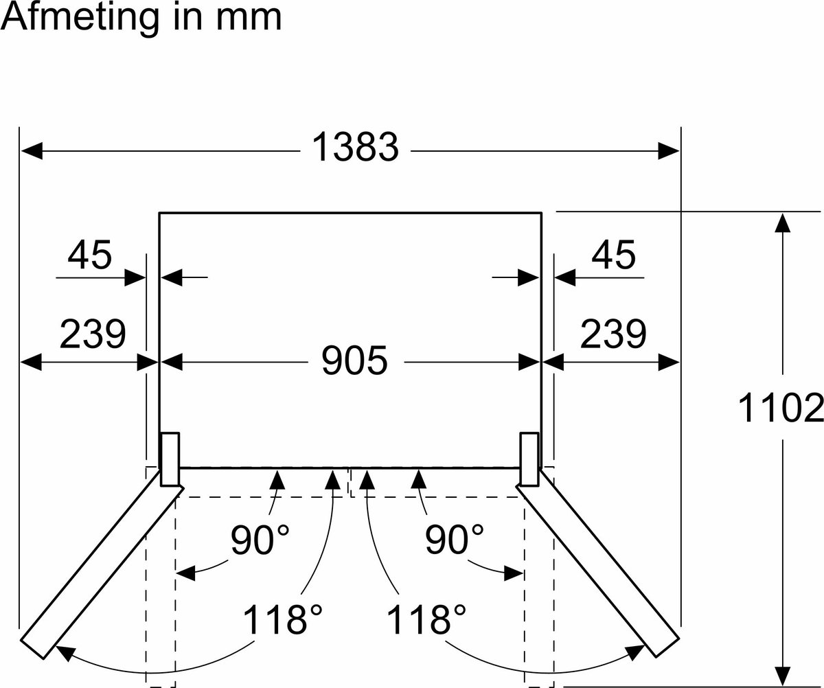 - Plaatsing en ventilatie: geef de Bosch KFD96APEA voldoende ruimte rondom voor luchtcirculatie, vooral aan de achterzijde en bovenkant. Dit bevordert de koelprestatie en verlengt de levensduur van het apparaat. Exacte marges zijn niet vermeld; raadpleeg de handleiding voor het aanbevolen minimum.