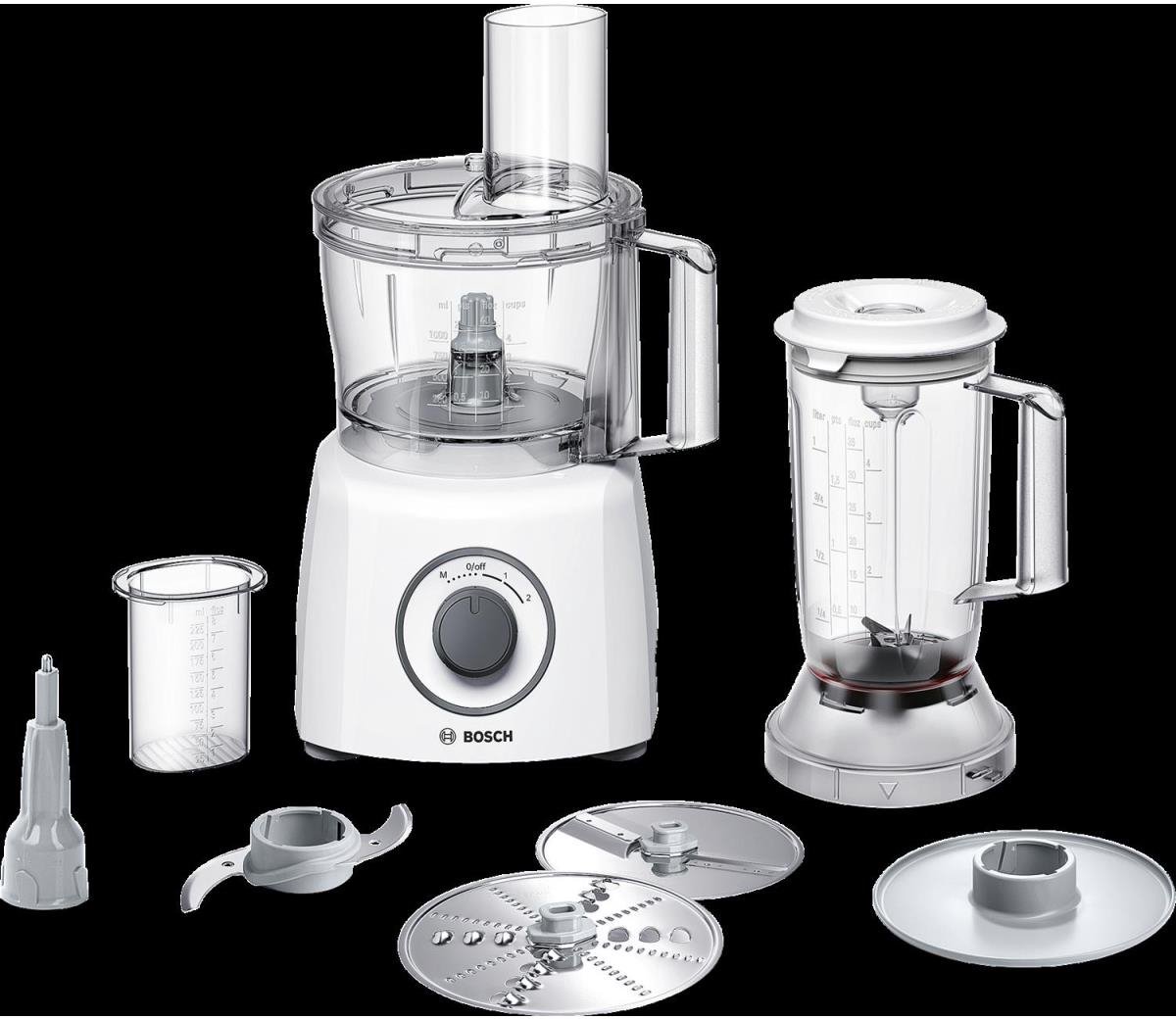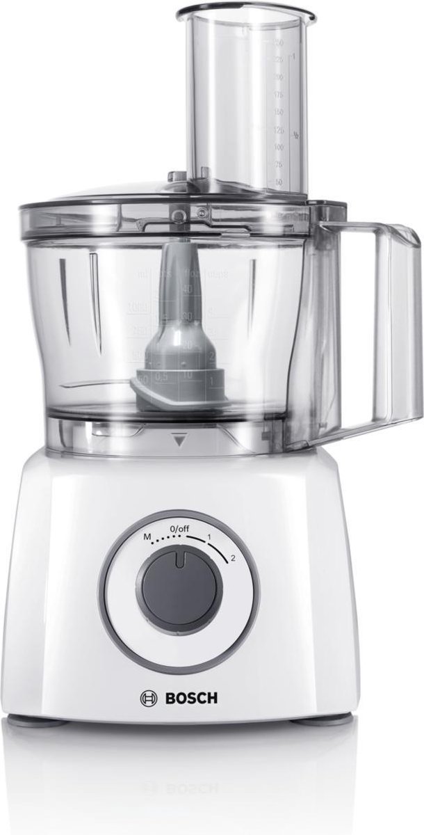 De Bosch MCM3200W is een compacte foodprocessor voor iedereen die snel wil hakken, snijden, raspen, kloppen of een smoothie wil mixen zonder gedoe met losse hulpmiddelen. Dankzij de meegeleverde messen en schijven pak je met één apparaat de meeste dagelijkse keukenklussen aan, van uien fijnsnijden tot een snelle shake bij het ontbijt.