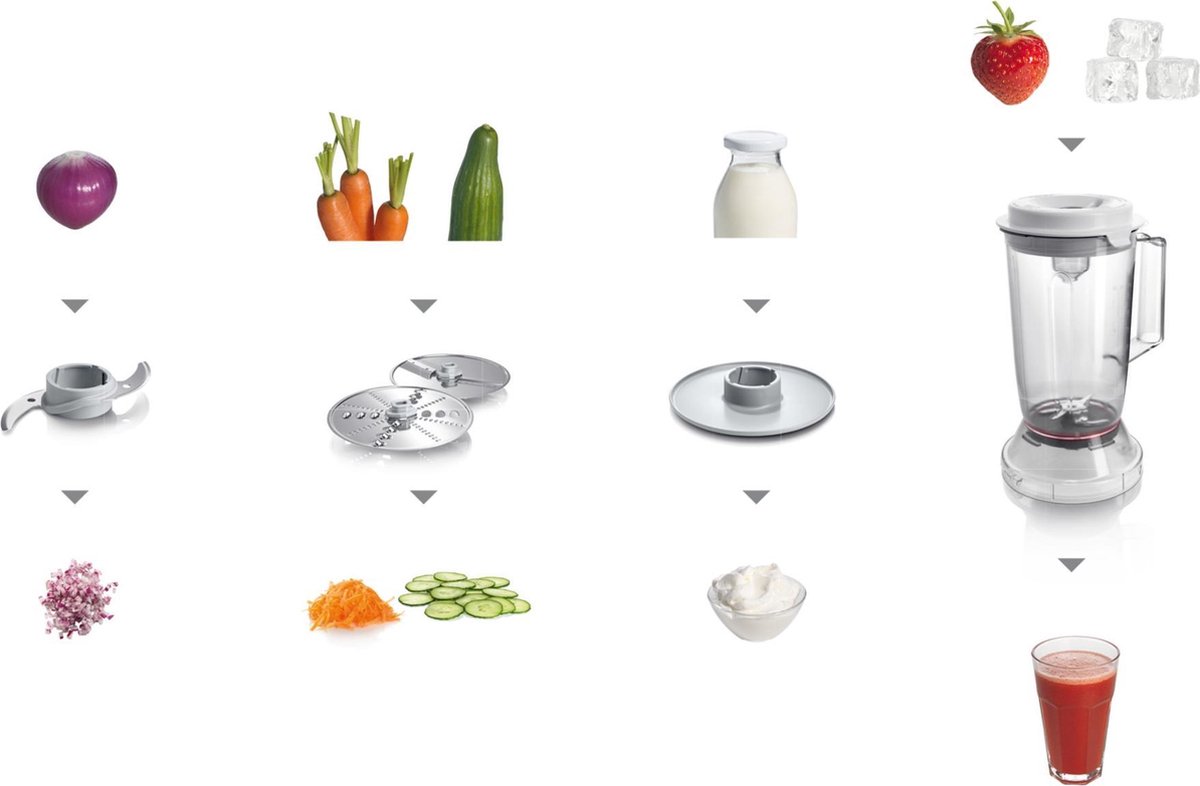 - Kies het juiste opzetstuk: het RVS mes voor hakken en mixen, de snij- of raspschijven voor plakjes en rasp, de klopschijf voor luchtig kloppen.