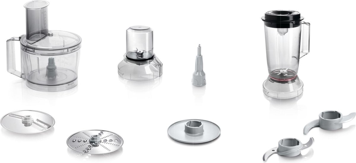 De veelzijdige set accessoires opent een breed palet aan bereidingen: raspen, snijden, malen, mengen, kneden, kloppen en meer. In de mengkom kun je tot 0,8 kg deeg verwerken, wat geschikt is voor een brood of een pizza voor het gezin. De dubbelzijdige schijven halen meer uit dezelfde schijfdrager: dik of dun snijden, grof of fijn raspen, afhankelijk van het gerecht.