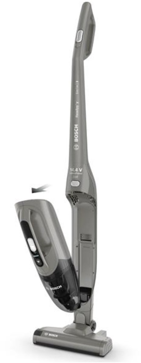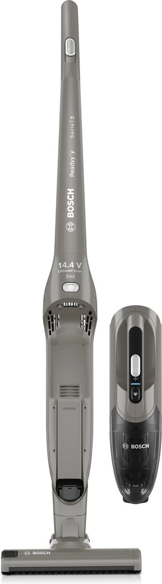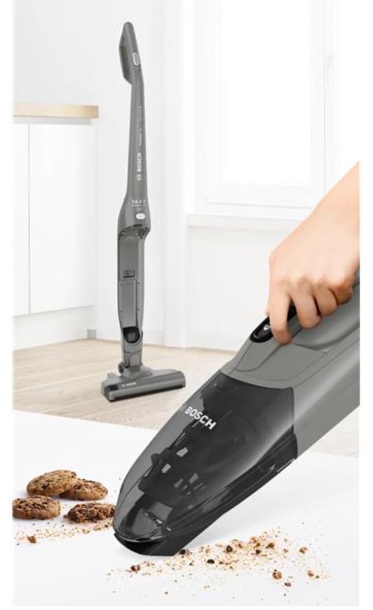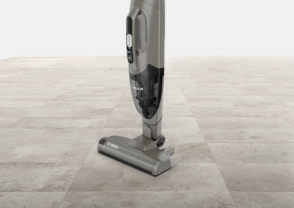 De Bosch BBHF214G is uitgevoerd in een neutrale grijze kleur. Dat oogt rustig in moderne interieurs en steekt niet af wanneer je hem in het zicht parkeert. Het apparaat is zakloos, wat betekent dat je geen stofzakken hoeft te kopen of te vervangen. In plaats daarvan vangt een stofreservoir het vuil op, waarna je het bakje leegt boven de vuilnisbak.