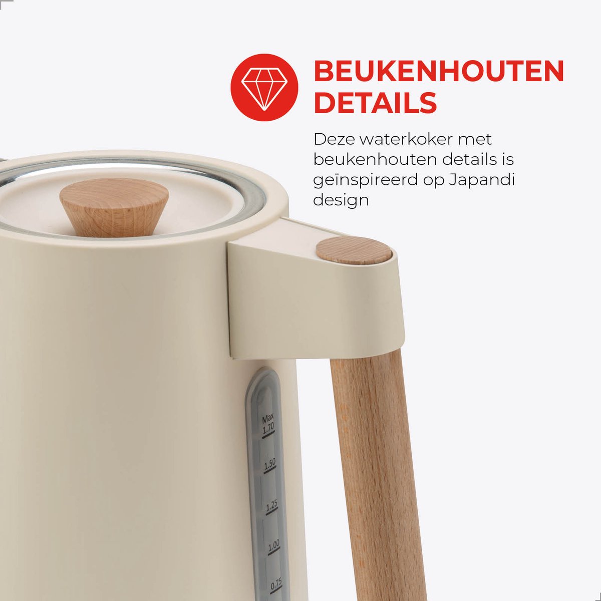 - Wie een elegante, roestvrijstalen waterkoker met natuurlijke beukenhouten accenten wil die mooi oogt op het aanrecht.