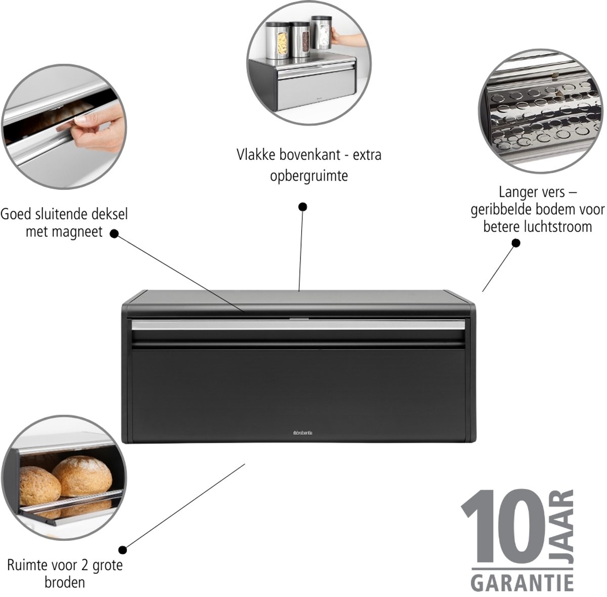 - Dagelijks gemak: De grote greep en magnetische, stille sluiting maken openen en sluiten intuïtief. Leg broden naast elkaar om de inhoud overzichtelijk te houden. Gebruik bakpapier of een broodzak voor losse bolletjes om kruimels te beperken.