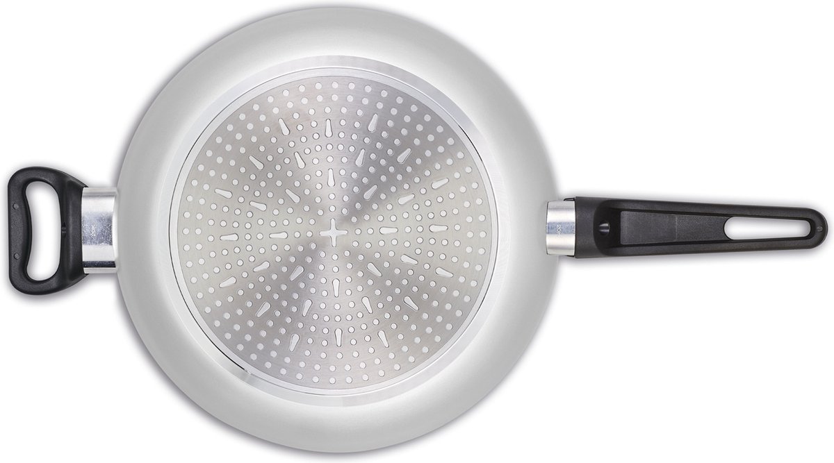 Met een diameter van 28 cm en een maximaal volume van 4 liter (volgens de fabrikant/listing) is dit formaat een fijne middenweg: groot genoeg om royaal te kunnen stoven of roerbakken, maar nog hanteerbaar voor dagelijkse taken. Gewicht en exacte hoogte zijn niet vermeld, maar door het aluminium is de pan in de regel lichter dan vergelijkbare stalen of gietijzeren pannen, wat prettig is bij werken met één hand of bij het overgieten van sauzen.