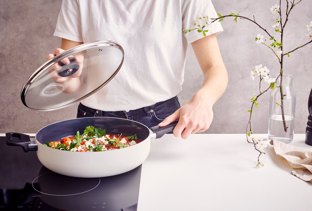 - Gerechten die de pan perfect kanStoofpotten, curry’s, risotto, shakshuka, roerbakgroenten, kipblokjes aanzetten en daarna sudderen in saus, gehaktballen bruin bakken en laten garen onder deksel. De 28 cm maat biedt genoeg bodemoppervlak om vlees aan te zetten zonder stomen, terwijl het glazen deksel ideaal is voor het vervolg op lage stand.