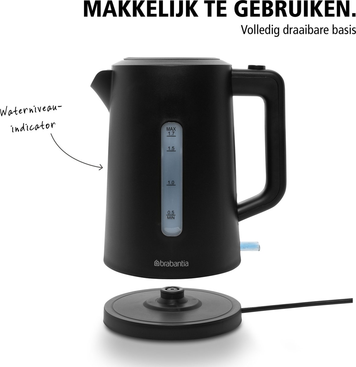 - Een voet die de waterkoker vanuit elke positie laat terugplaatsen, voor links‑ én rechtshandig gebruik.