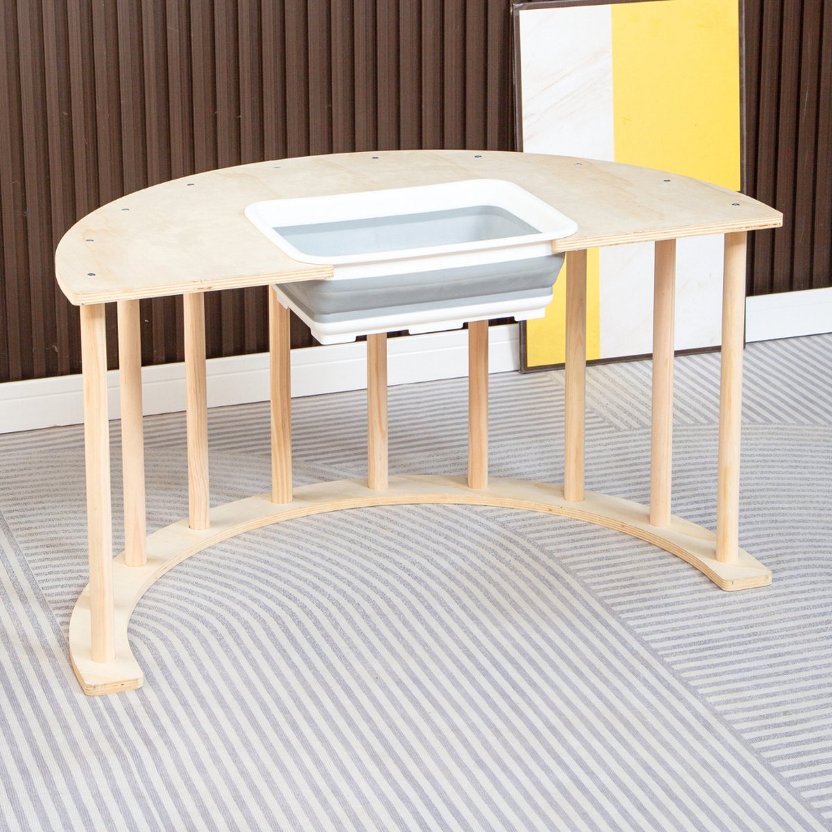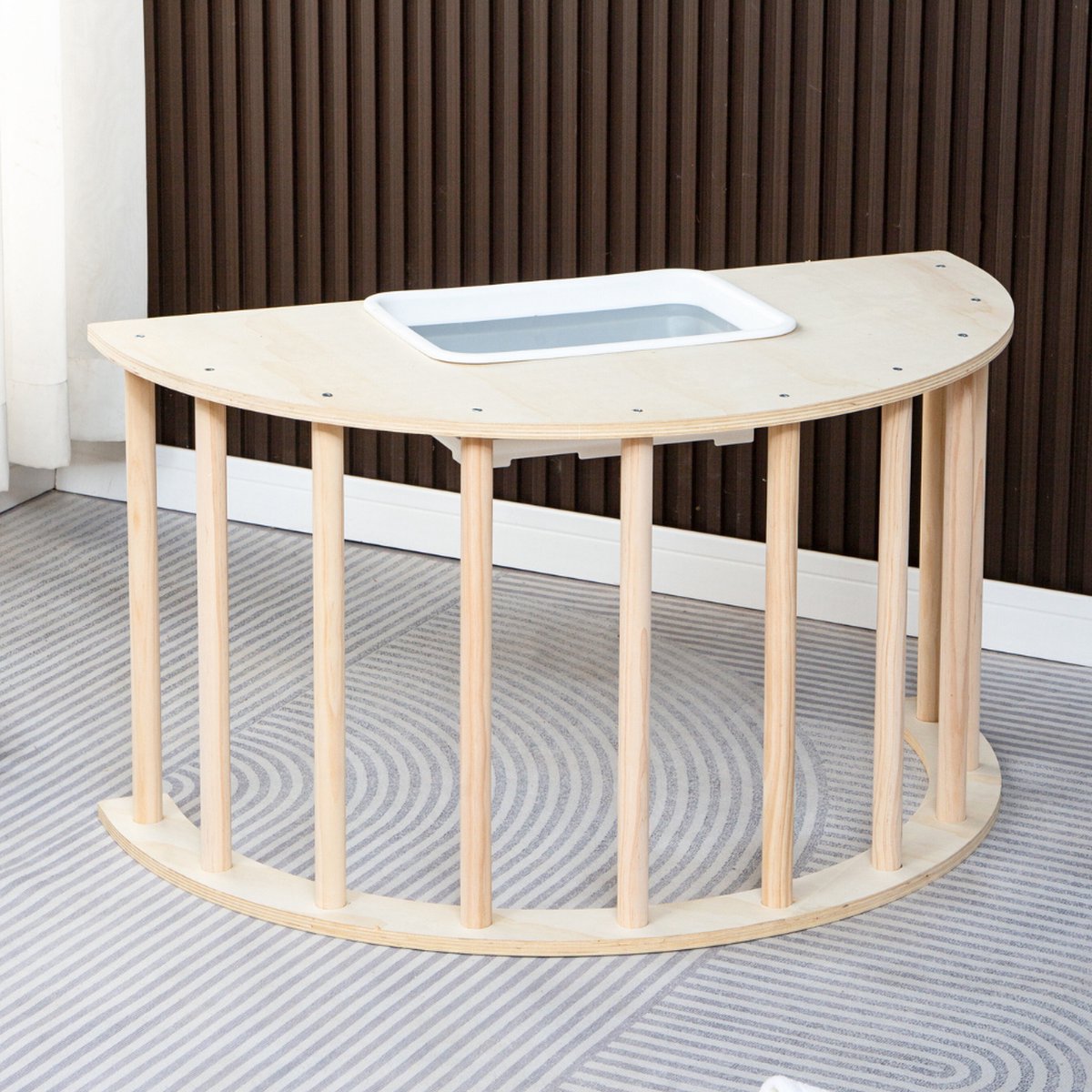 De speelboog wordt geleverd met een opbergbak — handig om blokken, knutselspullen of ander klein speelgoed bij de hand te houden. Deze toevoeging zorgt voor minder rommel en maakt opruimen gemakkelijker voor kinderen. (Let op: verdere specificaties van de opbergbak, zoals interne afmetingen of of deze afsluitbaar is, zijn Not specified.)