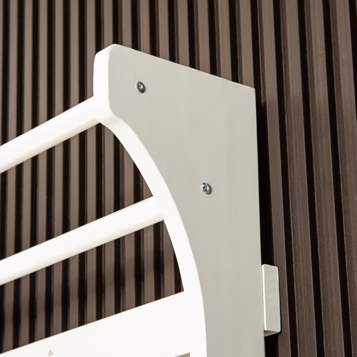 De Buxibo Klimwand is uitgevoerd in hout met een witte afwerking. Het natuurlijke materiaal geeft een warme uitstraling die goed past bij Montessori- of Scandinavisch geïnspireerde kinderkamers. De houten latten en frame zijn naar verwachting glad afgewerkt en afgeronde hoeken zijn genoemd als kindvriendelijk. Omdat het product een wandmontage heeft, neemt het weinig vloerruimte in beslag en is het geschikt voor kleine ruimtes.