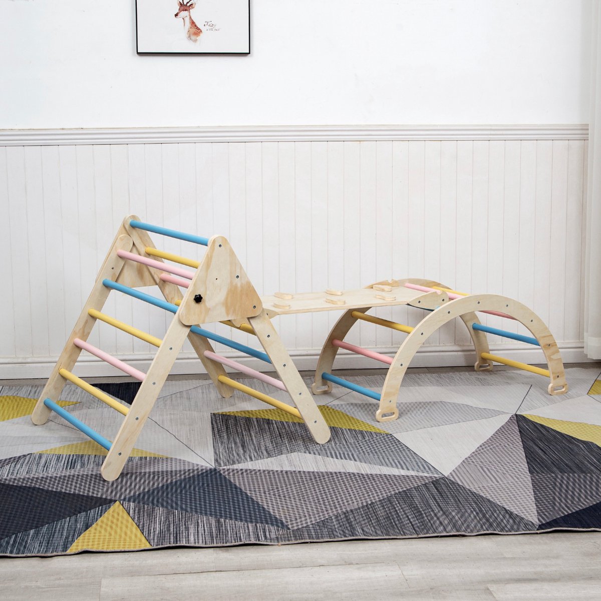 De Buxibo Klimset brengt een multifunctionele speelgym naar huis bestaande uit een opvouwbare driehoek, een klimboog en een helling met glijbaan. Het is een houten speeltoestel in zachte pastelkleuren dat gericht is op actief, creatief spel en ontwikkelingsgerichte activiteiten volgens Montessori-principes. Deze set is bedoeld voor jonge kinderen die motorische mogelijkheden willen ontdekken, klimmen en rollen in een veilige, binnenhuisomgeving.