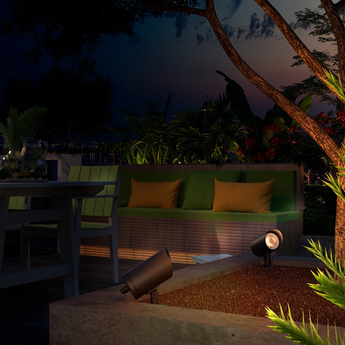 Waar het bij helpt: als de beplanting in de loop van het seizoen groeit, pas je eenvoudig de lichtrichting aan voor het beste effect. Richt bijvoorbeeld schuin omhoog voor dramatische boomverlichting of langs een gevel voor een strijklicht dat structuur en diepte benadrukt.
