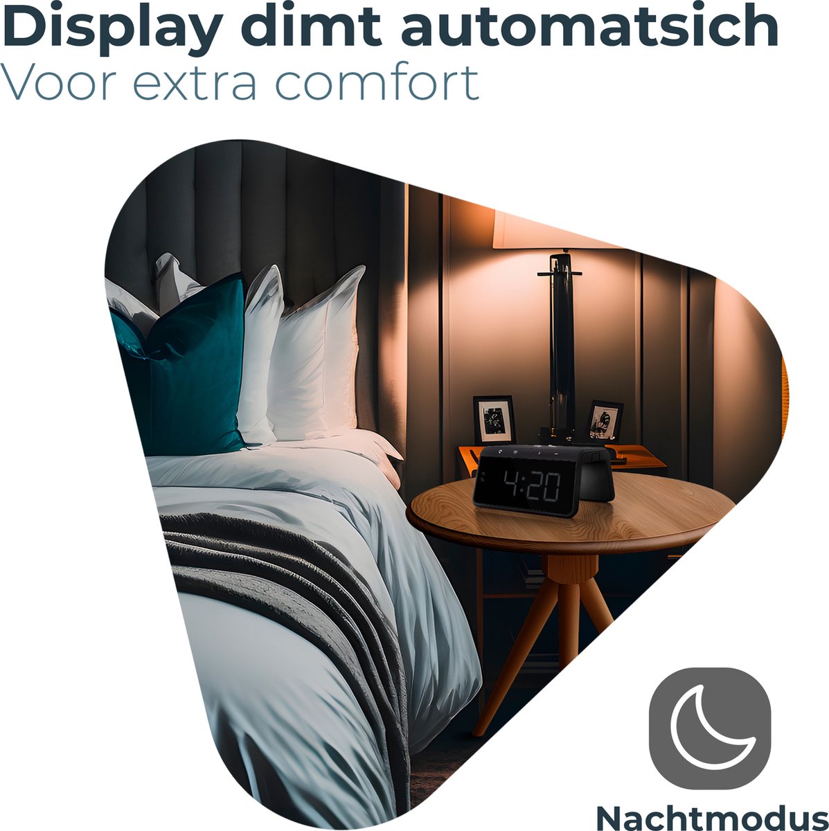 Het display wordt automatisch gedimd tijdens de nacht zodat de klok niet onnodig veel licht geeft, maar wel voldoende blijft om de tijd af te lezen. Om 07:00 uur gaat de helderheid weer omhoog. Deze automatische regeling is praktisch voor een ongestoorde slaap en voorkomt storende felheid in een donkere slaapkamer.