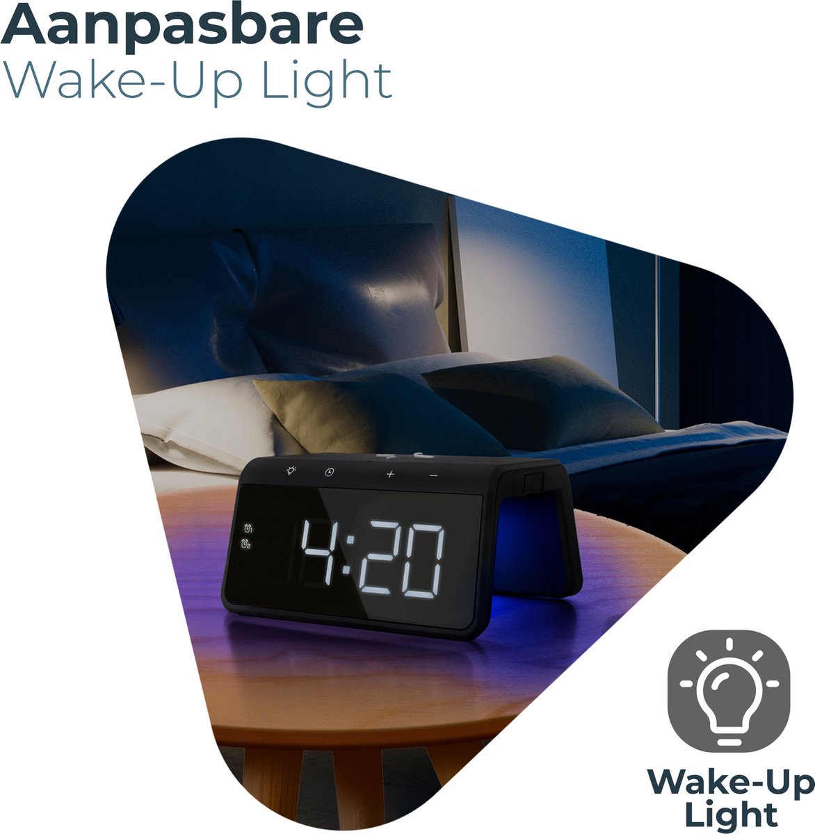 Overzicht:Deze wekker met draadloze oplader is het ideale hulpje voor Nederlandse nachtkastjes, omdat hij klok, oplader en nachtlampje combineert. Compatibel met Qi-technologie en geleverd met QC3.0-voedingsadapter voor snel en veilig laden.