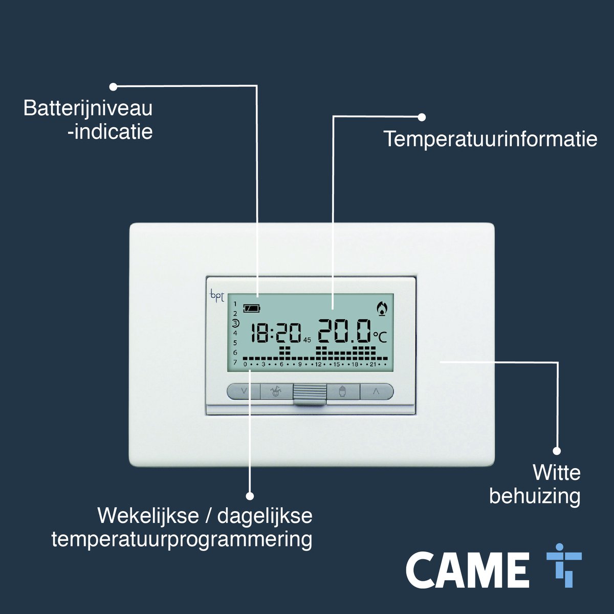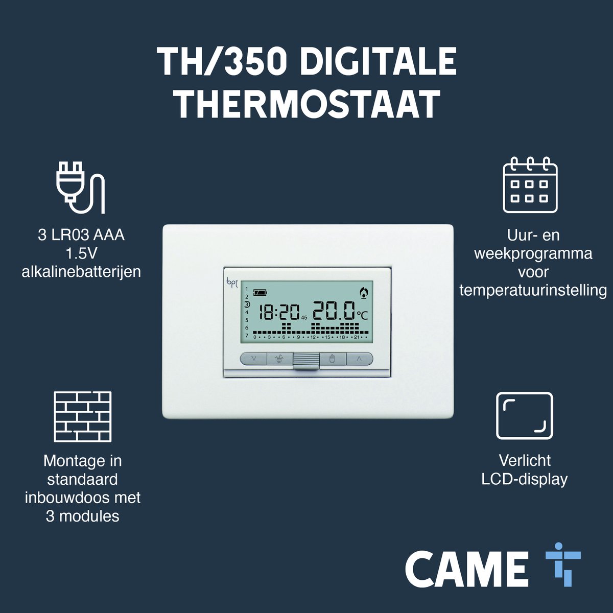 De CAME TH/350 digitale chronothermostaat is een inbouwmodel met weekprogrammering voor comfortabele, energiezuinige verwarming in Nederlandse woningen. Omdat hij op 3 AAA-batterijen werkt en een achtergrondverlicht scherm heeft, installeer je hem snel zonder netaansluiting en bedien je hem eenvoudig.