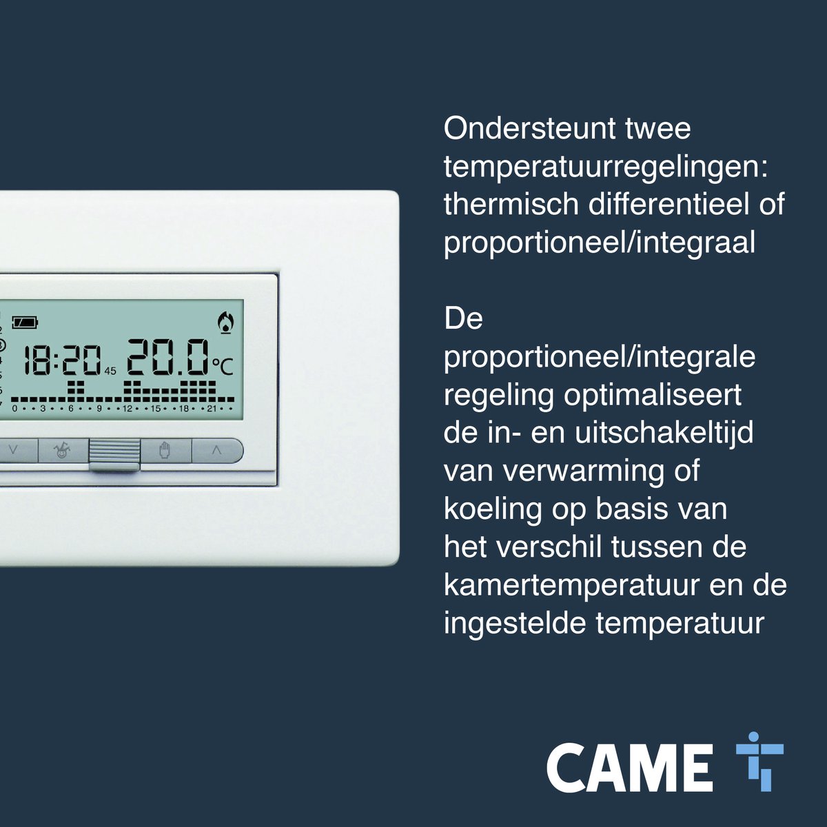 De CAME TH/350 is een compacte, digitale chronothermostaat voor inbouw die comfort en besparing slim combineert. Dit inbouwmodel werkt op batterijen en biedt een helder verlicht scherm, weekprogrammering en geavanceerde regeltechnieken om de temperatuur stabiel en zuinig te houden. Daarmee is het een doordachte keuze voor wie in huis of bij een renovatieproject een moderne, strak weggewerkte thermostaat wil zonder bedrading naar netspanning.