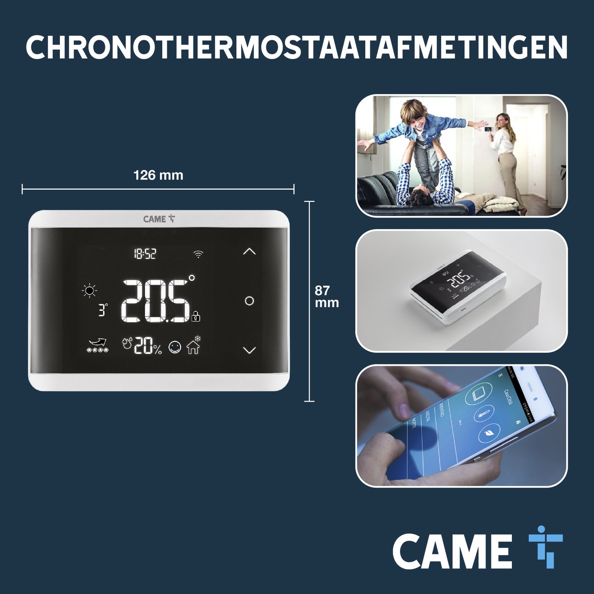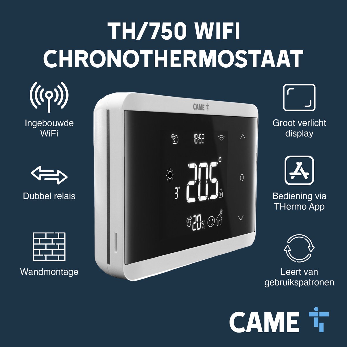 - Primaire focus ligt op CAME TH/750 wifi-chronothermostaat, met nadruk op dubbele relais, app-bediening en energiezuinige bediening.