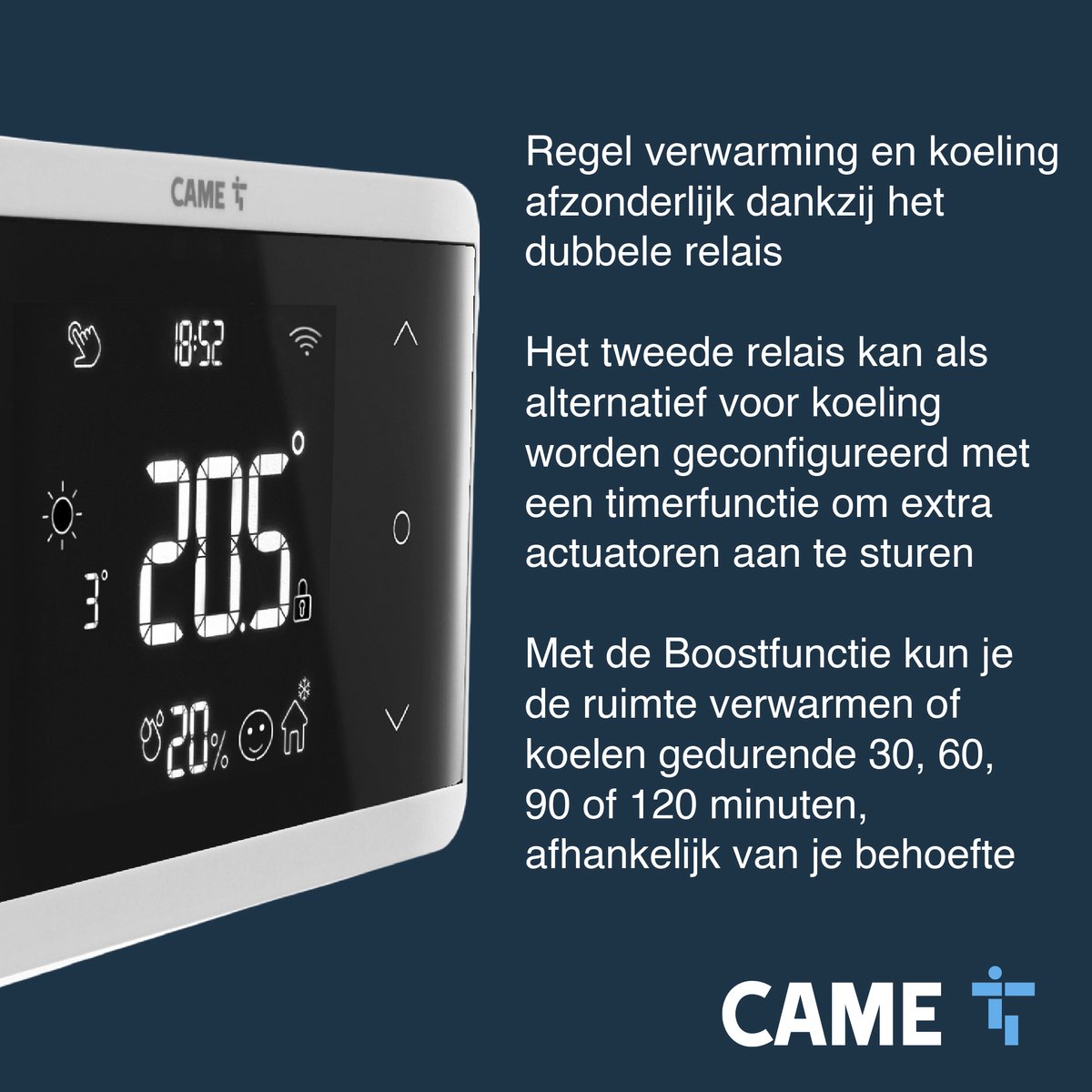 - Wil je vandaag nog de stap zetten naar flexibele klimaatregeling met twee relais, app en spraak? Controleer je inbouwsituatie en wifibereik, en kies vervolgens de CAME TH/750 wifi-chronothermostaat voor een nette, toekomstbestendige oplossing.