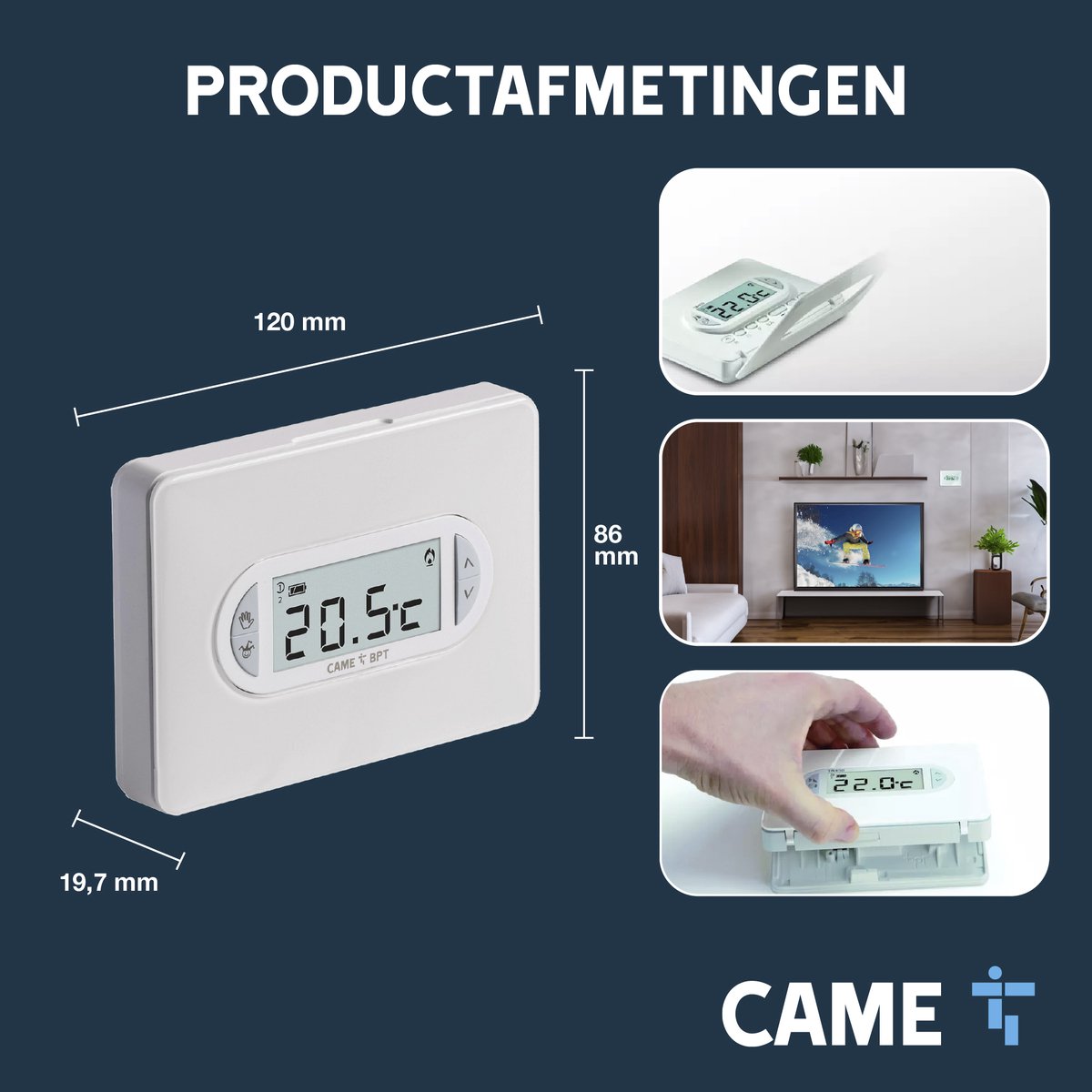 Over de materialen, afmetingen en het gewicht geeft de beschrijving geen exacte cijfers. Wel benadrukt CAME dat de thermostaat uit duurzame materialen is vervaardigd, met het oog op langdurige betrouwbaarheid. Voor een wandmodel is dat essentieel: je wilt het apparaat één keer degelijk plaatsen en er vervolgens jaren geen omkijken meer naar hebben.