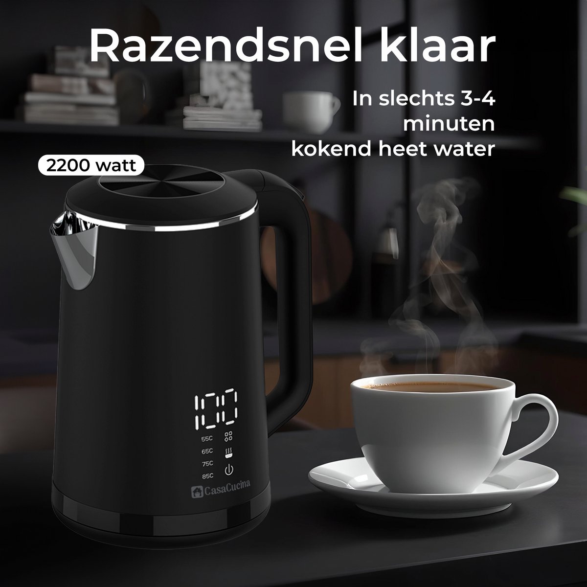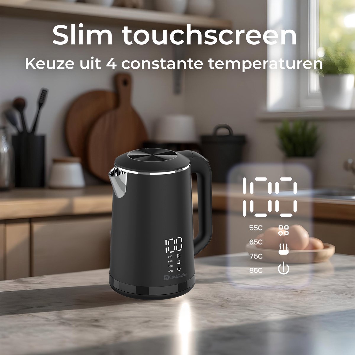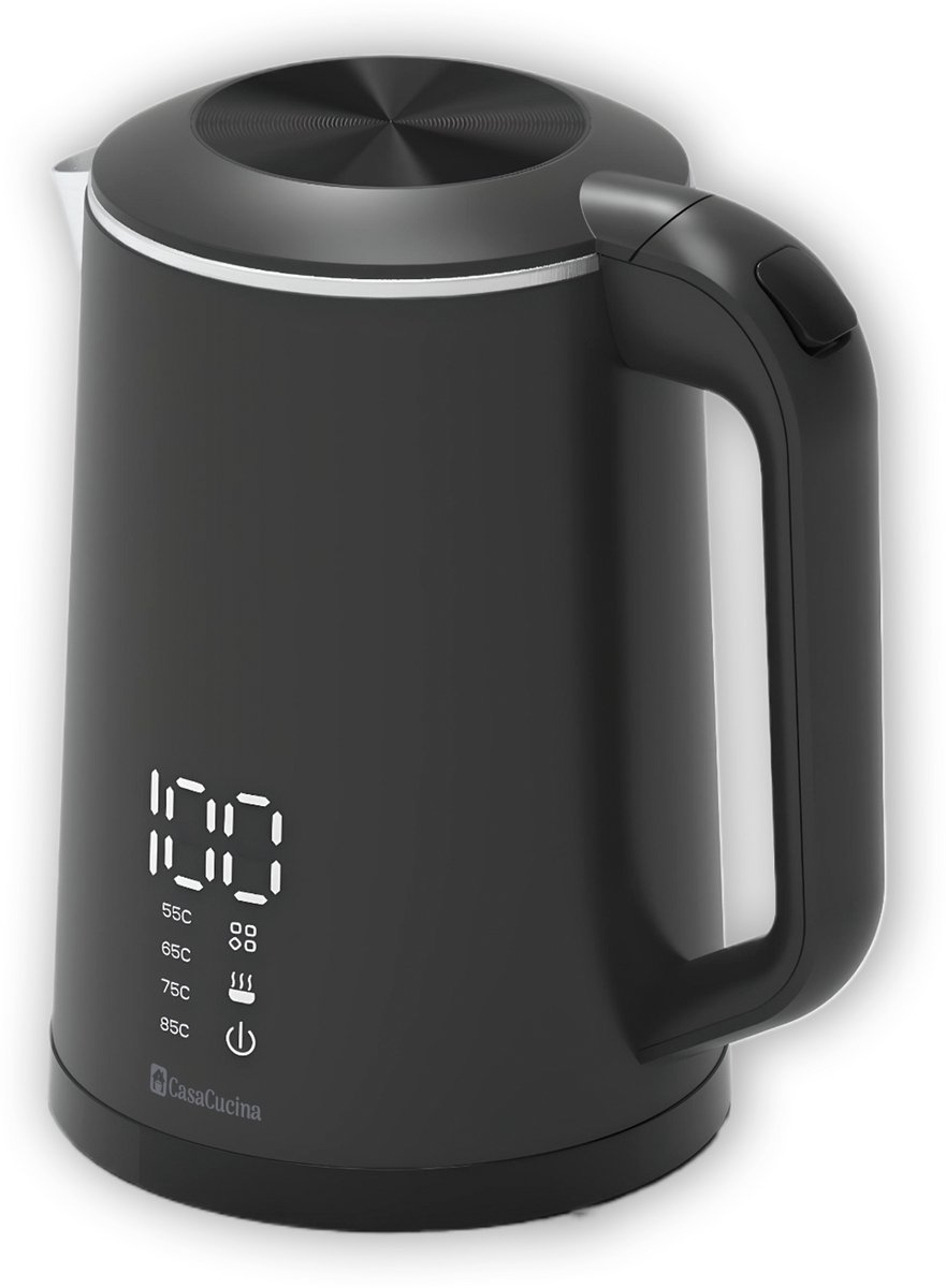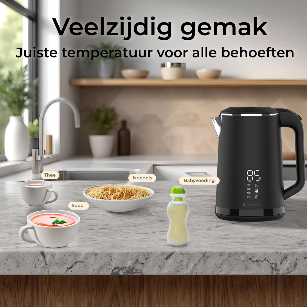De CasaCucina waterkoker is een moderne, dubbelwandige waterkoker met nauwkeurige temperatuurregeling, warmhoudfunctie en een royale inhoud van 1,7 liter. Dankzij de koelblijvende buitenkant en de gebruiksvriendelijke LED‑aanraakbediening is hij zowel veilig als comfortabel in dagelijks gebruik. Of je nu groene thee, filterkoffie of kruidenthee bereidt: met de instelbare temperatuur van 55 tot 100 °C zet je je warme drankje precies zoals het hoort.