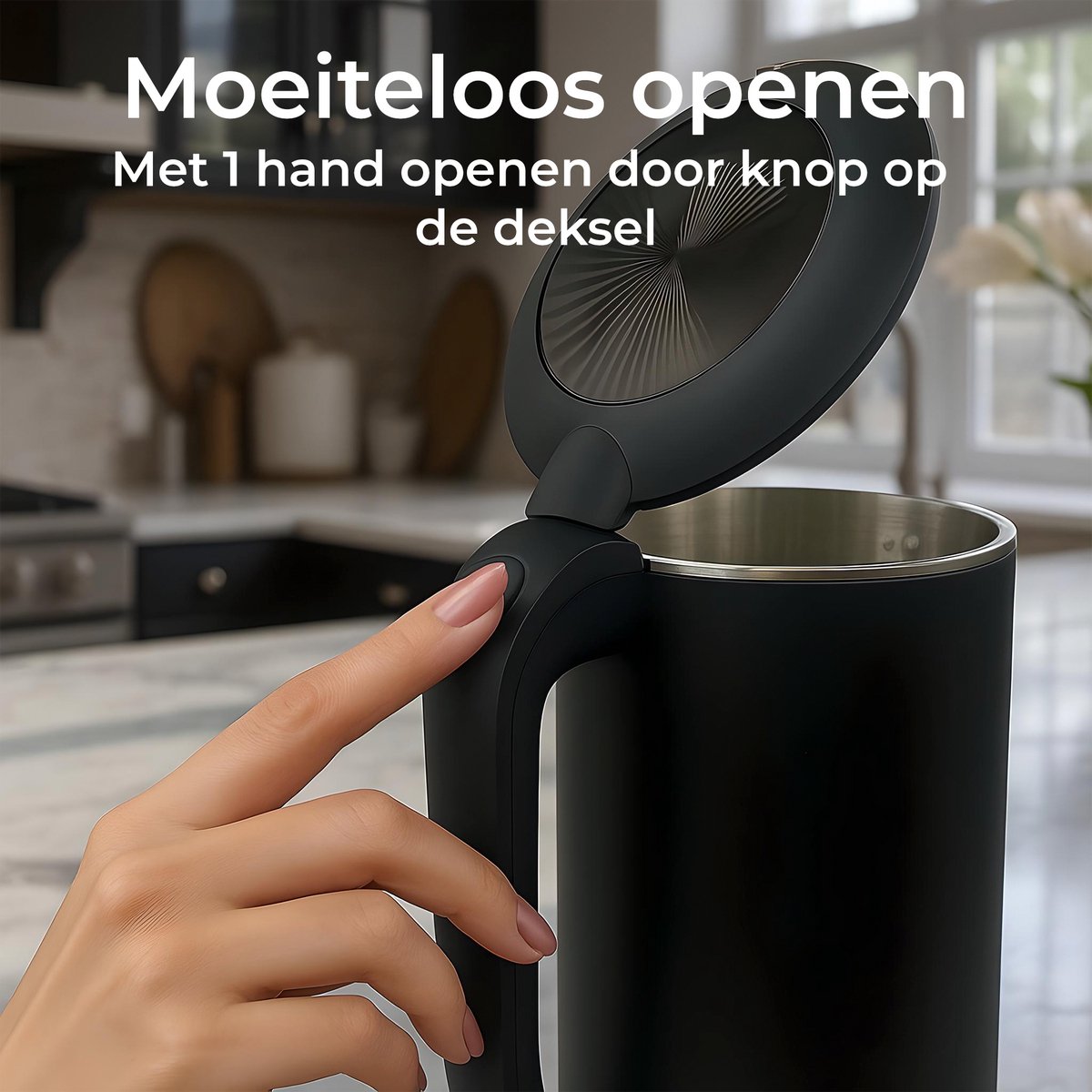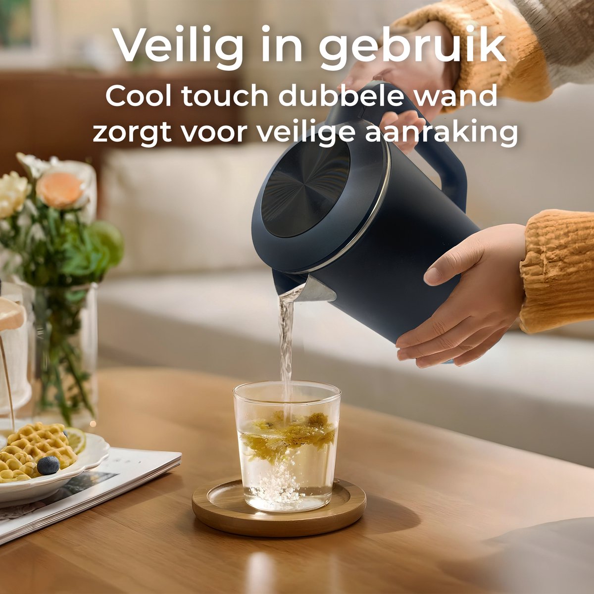 De warmhoudfunctie ontlast je ritme. Je hoeft niet te haasten om precies op het moment van koken klaar te staan. Ben je even afgeleid? Het water blijft op temperatuur tot je het nodig hebt. Daarbij is de dubbelwandige, koelblijvende buitenzijde aangenaam in gebruik. Je pakt de kan met vertrouwen op, ook als je net gekookt hebt.