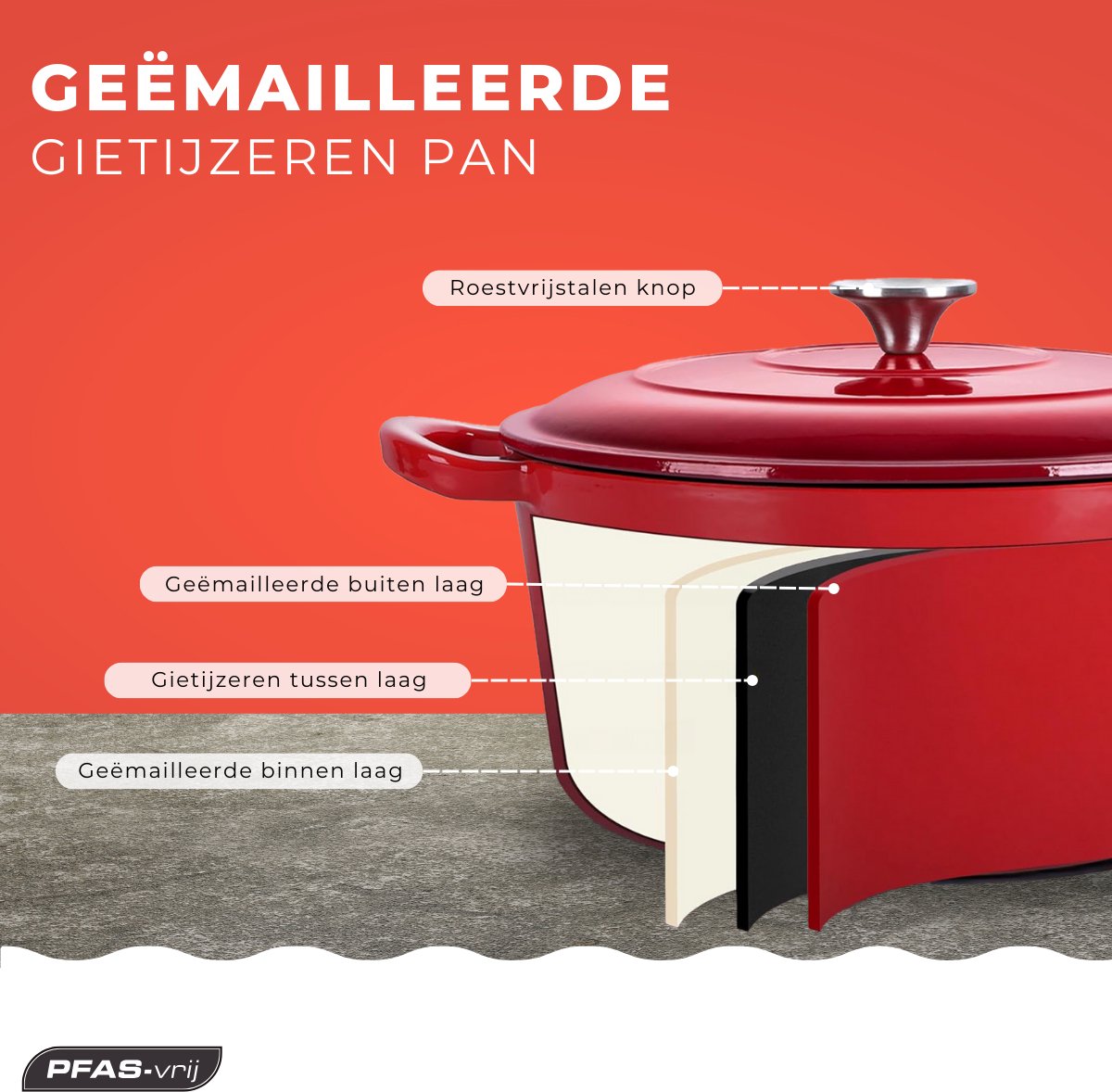 Emaille anti-aanbaklaag zonder PTFE/PFAS, makkelijker schoon te houden Emaille kan barsten of chippen bij ruwe behandeling — voorzichtigheid geboden