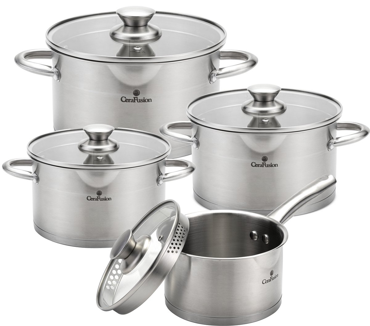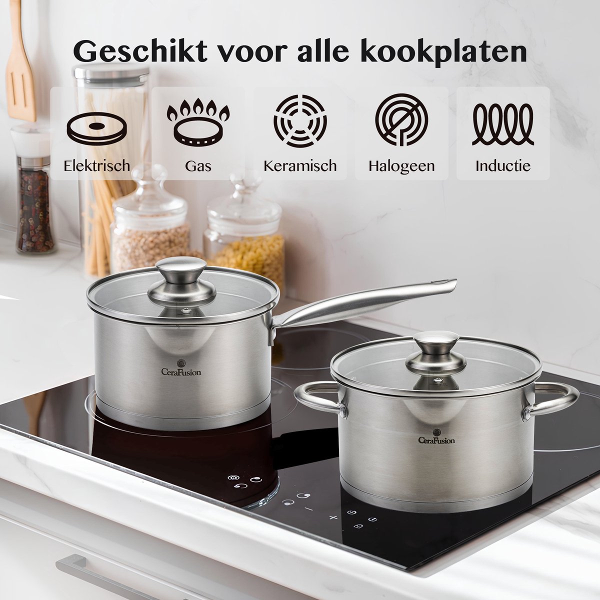 De CeraFusion RVS pannenset is een 8-delige set roestvrijstalen pannen die ontworpen is voor zowel de enthousiaste thuiskok als de professionele keuken. De set bevat vier pannen met bijpassende glazen deksels en combineert een satijnafwerking met een meerlagige inductiebodem voor gelijkmatige warmteverdeling.