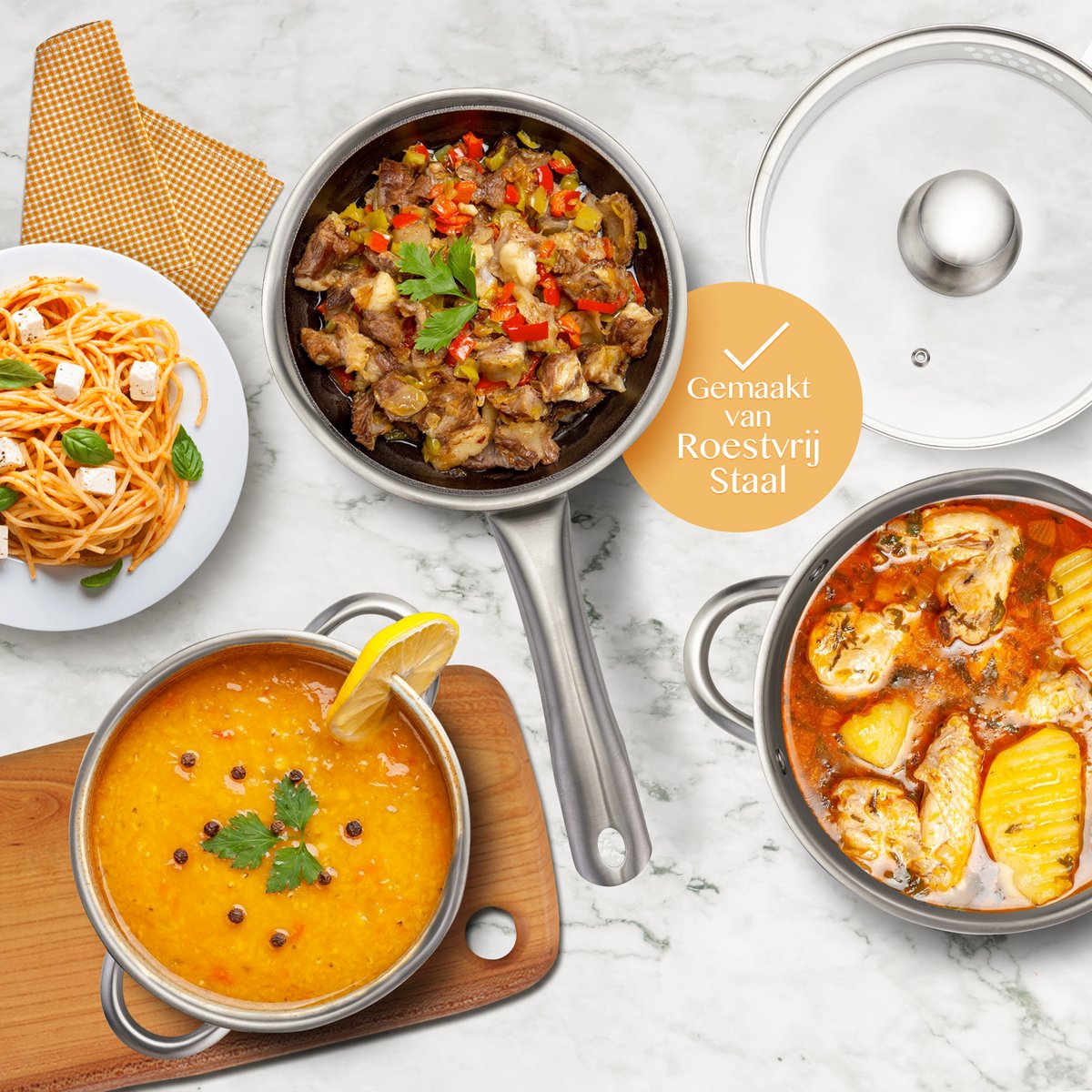 Heerlijk om weer met RVS-pannen te koken: geen anti-aanbaklaag die snel slijt en mogelijk ongezond is. Geweldige RVS-pannenset met goede kwaliteit.