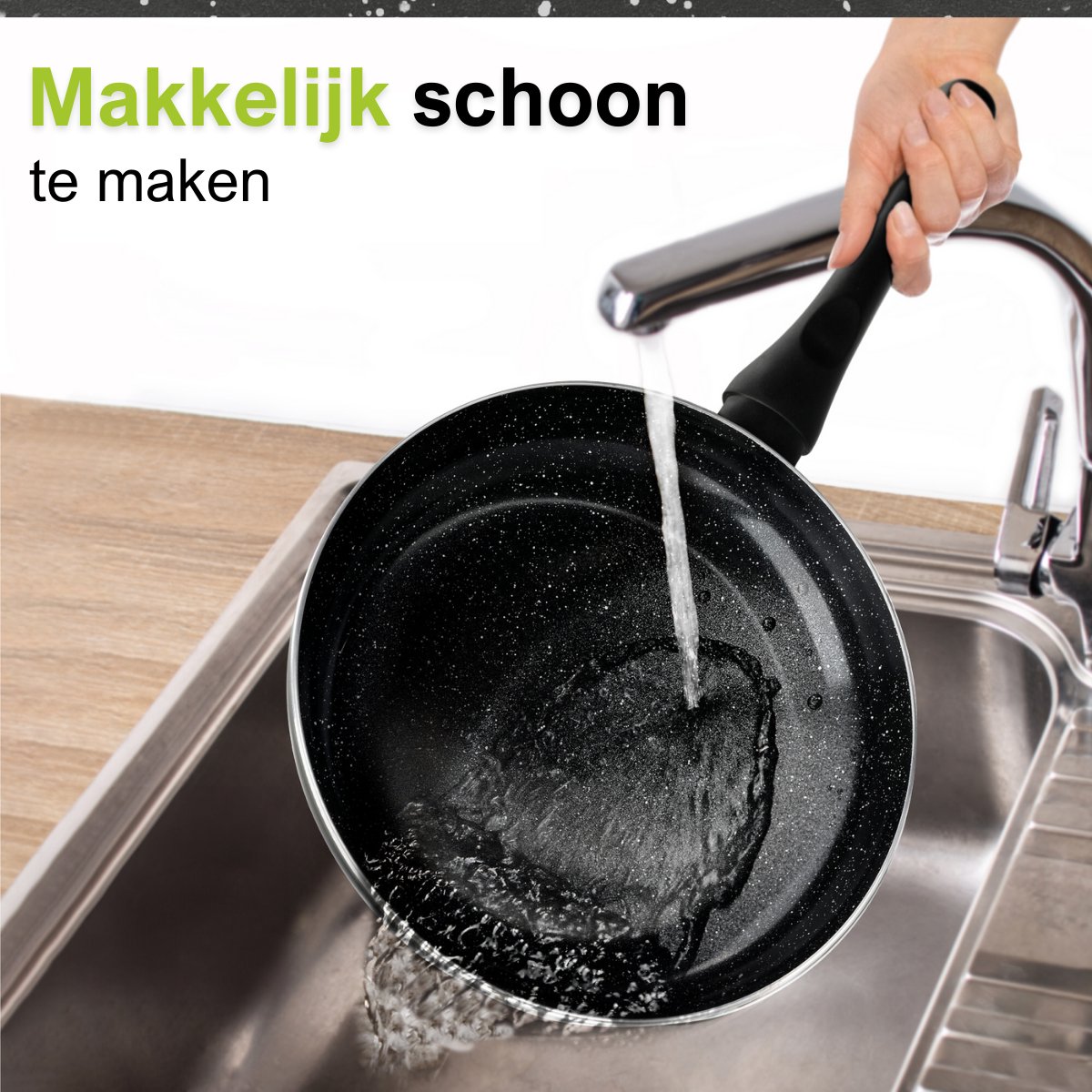 De pannen werden snel geleverd en waren goed verpakt. Even de handvatten monteren met de bijgeleverde schroevendraaier en schroeven — daarna koken met deze set is een feest. Niets blijft plakken; zelfs ketjap, dat bij andere pannen vaak een harde en bijna niet weg te krijgen laag vormt, is met deze pannen geen probleem. Makkelijk schoon te maken en ook vaatwasserbestendig. Geen giftige stoffen zoals bij sommige anti-aanbaklagen. Zeker een aanrader.