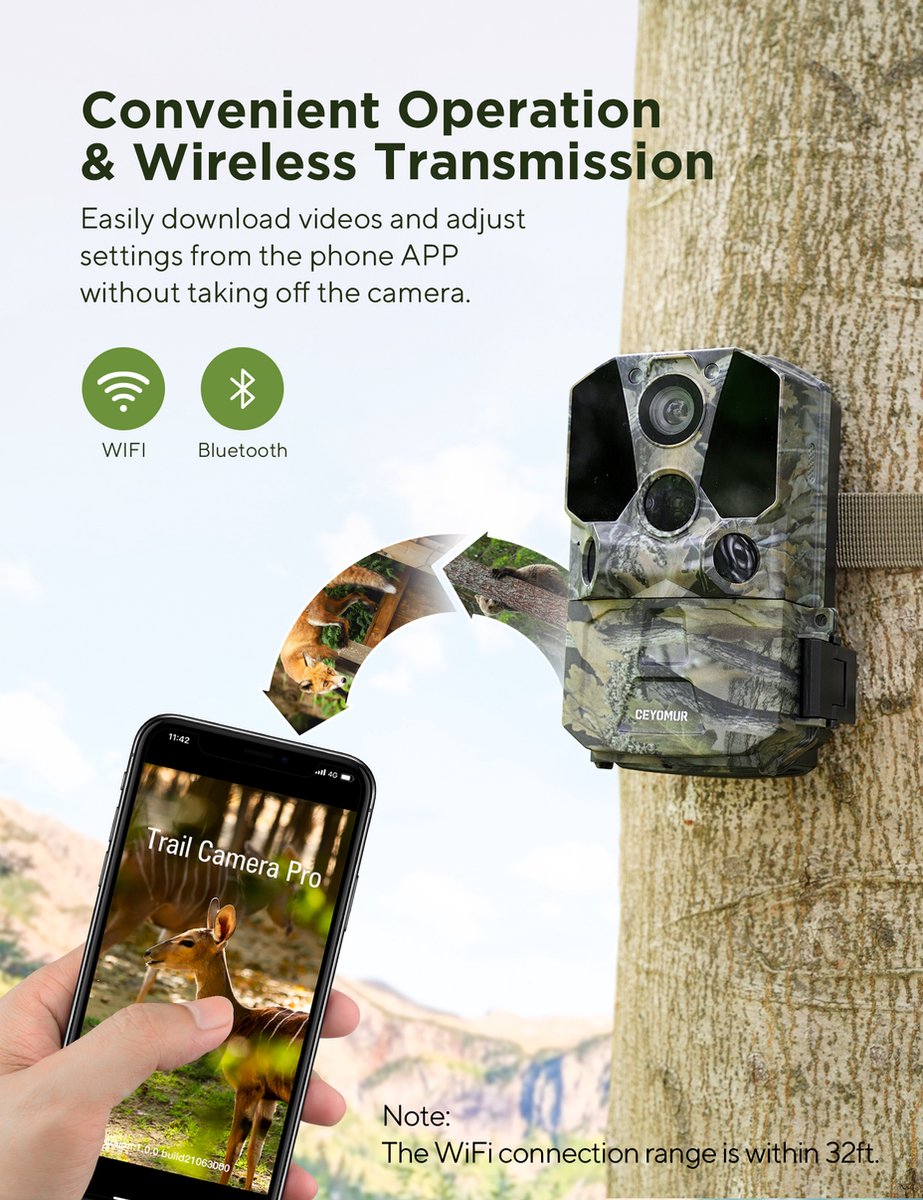 De CEYOMUR CY65 wildcamera is een compacte, draadloze wildcamera met wifi- en bluetoothverbinding, ontworpen voor natuurliefhebbers, jagers en wie dieren in het veld wil observeren zonder vaak terug te hoeven komen om beelden te halen. De camera belooft hoge resolutie foto’s tot 30MP, 1296P-video en een snelle reactietijd om momenten niet te missen.
