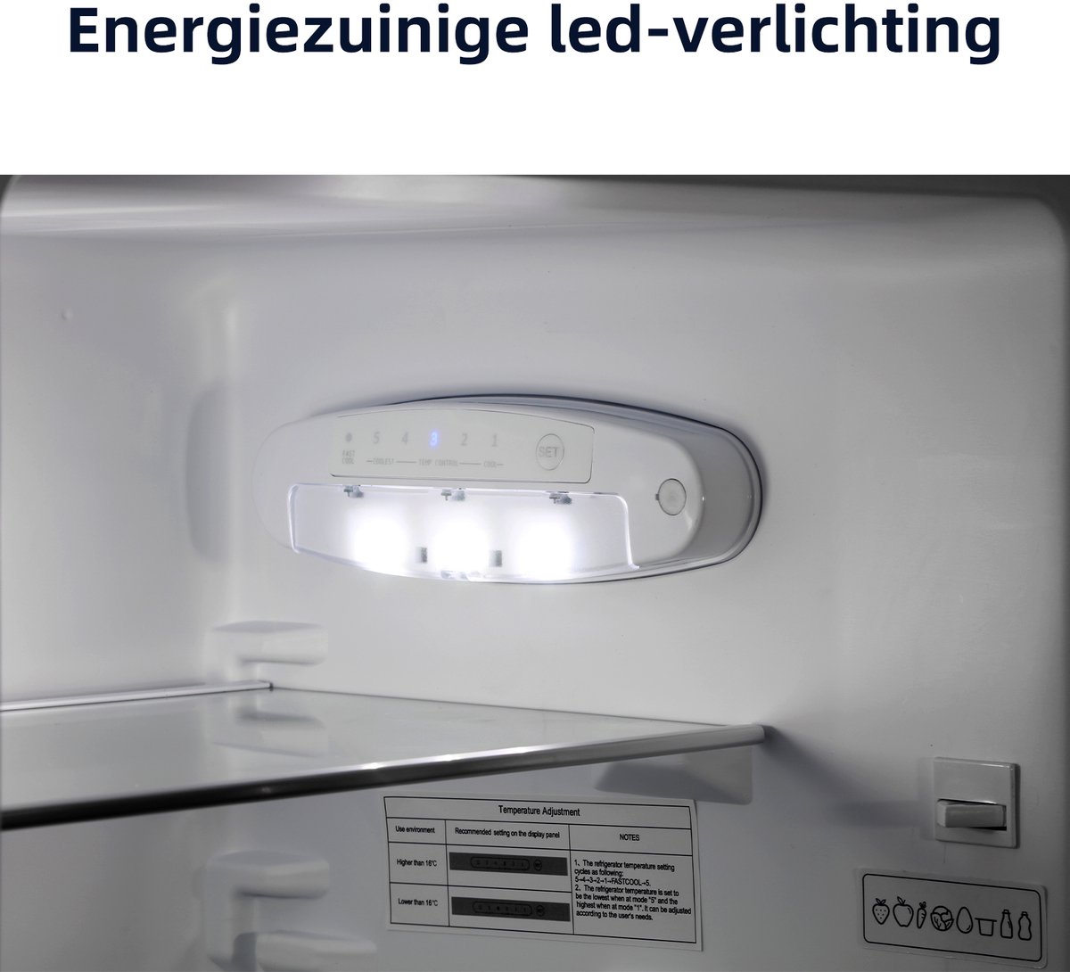 Compacte afmetingen 144 x 50 x 55 cm, toch 157 liter inhoud (bron: productvermelding, gecontroleerd 2025) Energielabel E; niet de zuinigste klasse (bron: productvermelding, gecontroleerd 2025)