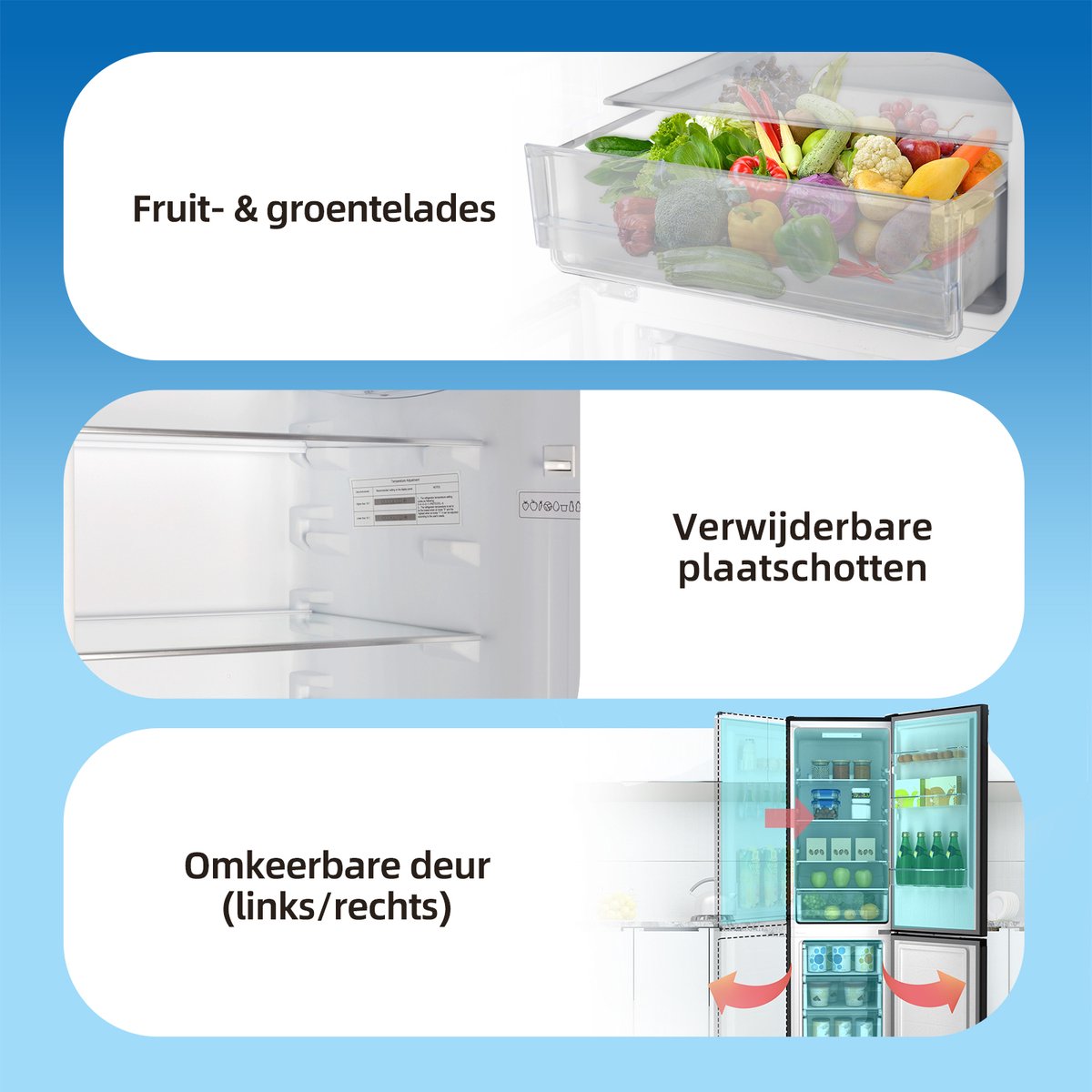 | Omkeerbare deur voor maximale plaatsingsvrijheid (bron: listing) | Netto inhoud per compartiment Niet vermeld; precieze verdeling onbekend |