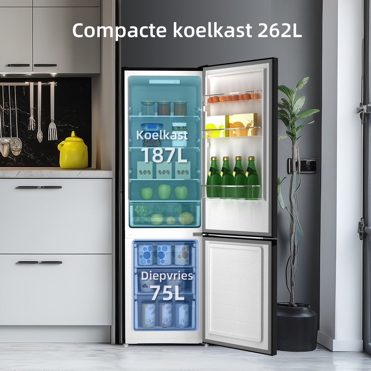 Met 262 liter totale inhoud biedt hij bovengemiddeld veel ruimte voor zijn klasse, terwijl hij relatief weinig vloeroppervlak inneemt (bron: listing, gecheckt 2025). De indeling is flexibel: koelen en vriezen zijn gecompartimenteerd en je kunt de ruimte naar wens organiseren. In het vriesgedeelte helpen glazen leggers je om stapelen overzichtelijk te houden en loze ruimte te voorkomen.