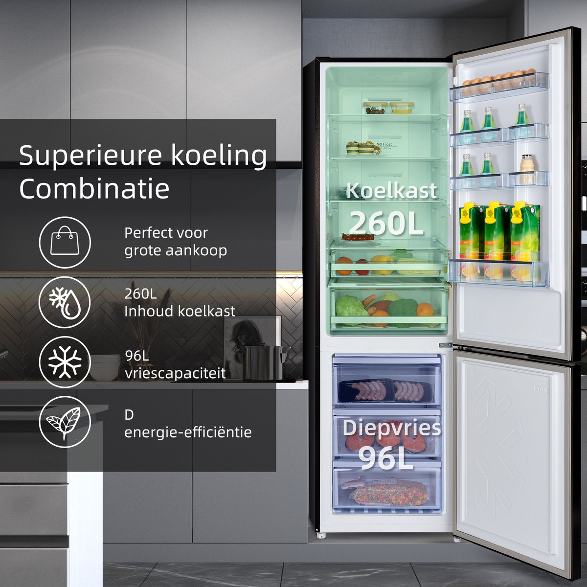 De LED-interieurverlichting is energiezuinig en gelijkmatig. Je ziet in één oogopslag wat er staat, tot aan de achterste plank. Dat scheelt zoekwerk en voorkomt dat restjes onzichtbaar achterin blijven staan (bron: productvermelding, gecontroleerd 2025).