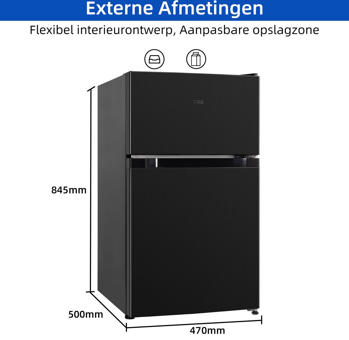 De CHiQ FTM86L4E is ontworpen voor compacte ruimtes: 470 × 500 × 845 mm (breedte × diepte × hoogte) volgens de vermelding (bron: listing, gecontroleerd 2025). Dat maakt hem laag en smal genoeg om onder of naast een werkblad te plaatsen, zonder dat hij krap aanvoelt in gebruik. De totale inhoud van 86 liter is bescheiden, maar in de praktijk verrassend bruikbaar wanneer je slim indeelt. Denk aan eenpersoonshuishoudens, stellen die weinig thuis eten, of als extra koelkast naast een grote Amerikaanse koel‑vriescombinatie.