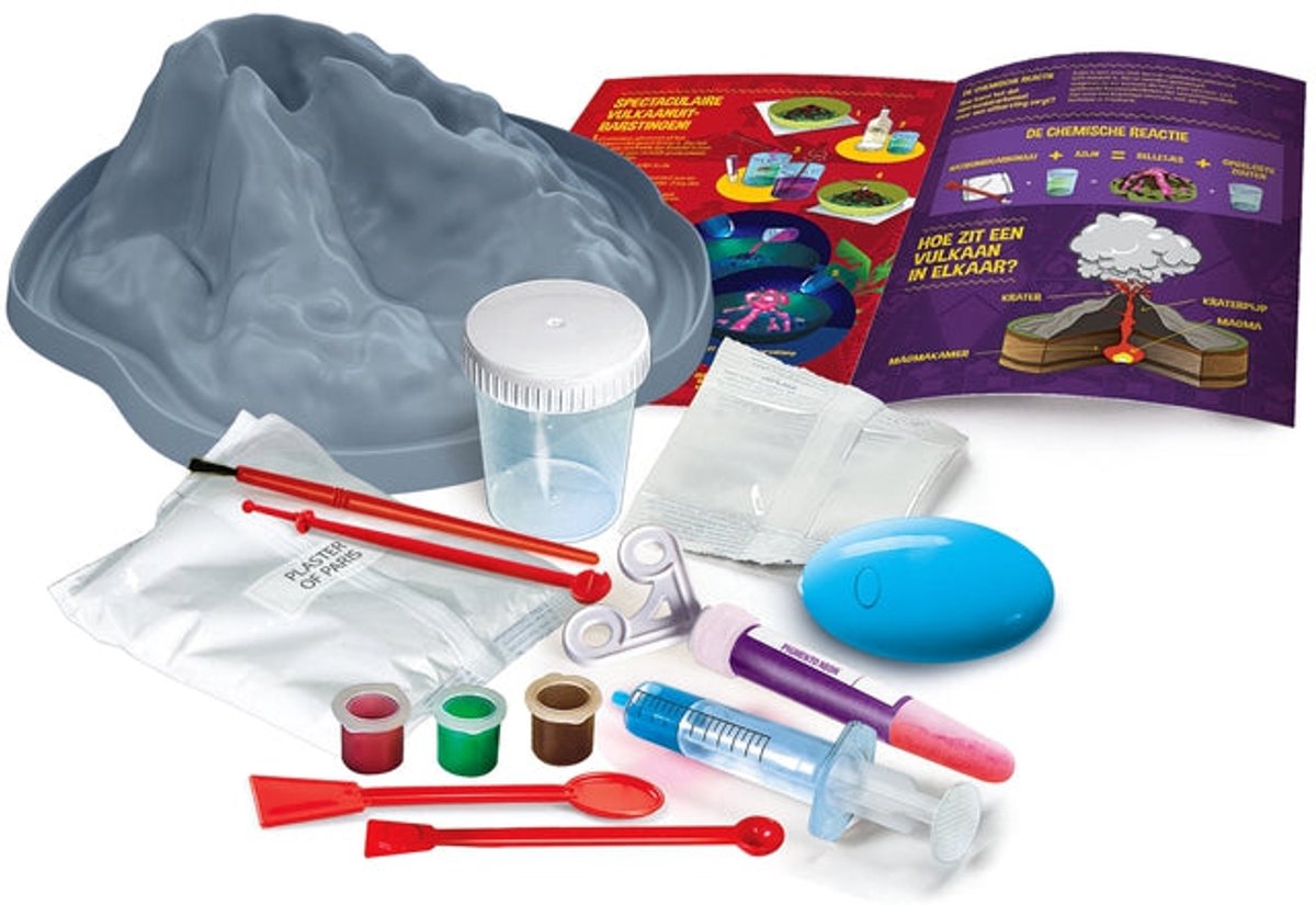 Je hoeft niet te speuren naar losse onderdelen: gips, mal, bicarbonaat, verf, neonkleurstof, de lamp en een handleiding zitten in de doos. Dat maakt de ervaring vlot en laagdrempelig. Het bouwproces (gieten en schilderen) is een oefening in fijne motoriek en plannen, de uitbarsting zelf laat de overgang zien van voorbereiding naar experiment. Het resultaat is een compleet project dat in overzichtelijke stappen te volgen is—fijn als je met een groepje kinderen werkt of als je weinig tijd hebt om voorwerk te doen.
