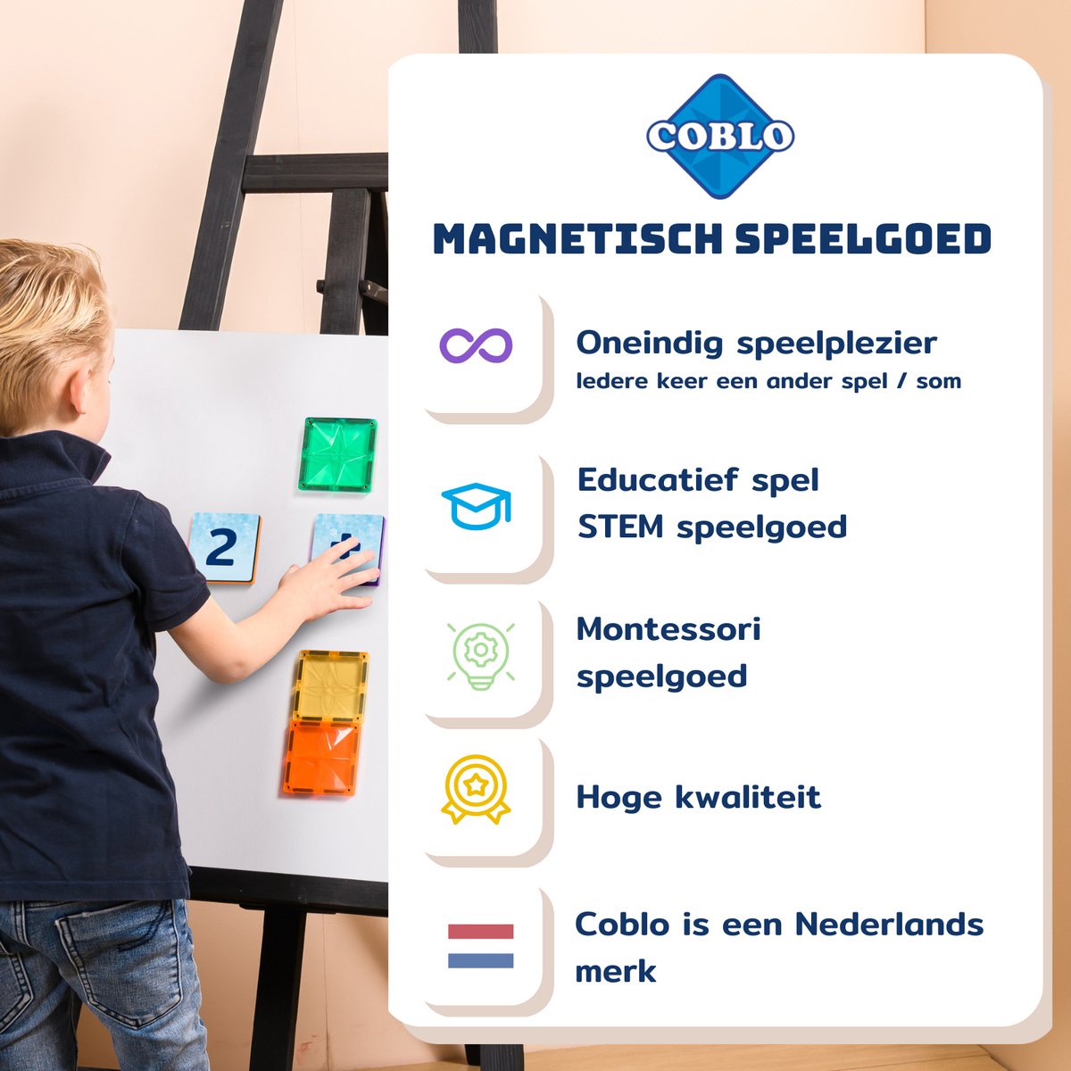 Coblo Magneet toppers Cijfers 60 stuks is een uitbreidingsset voor Coblo bouwstenen waarmee kinderen op een speelse, visuele manier kennismaken met cijfers en sommen. De set bevat getallen 0–9 in cijfers én stippen, plus rekentekens, zodat je van tellen naar echt rekenen kunt groeien. Het is ontworpen voor ouders en leerkrachten die spel en leren willen combineren zonder het plezier uit het spel te halen.