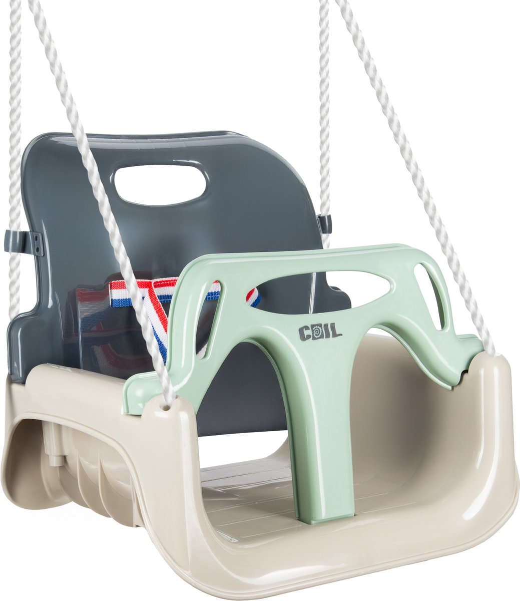 Specificaties: COIL kinder tuinemmer schommel sterk 3in1 + riemen, grijs en olijfgroen review veilig buitenspelen