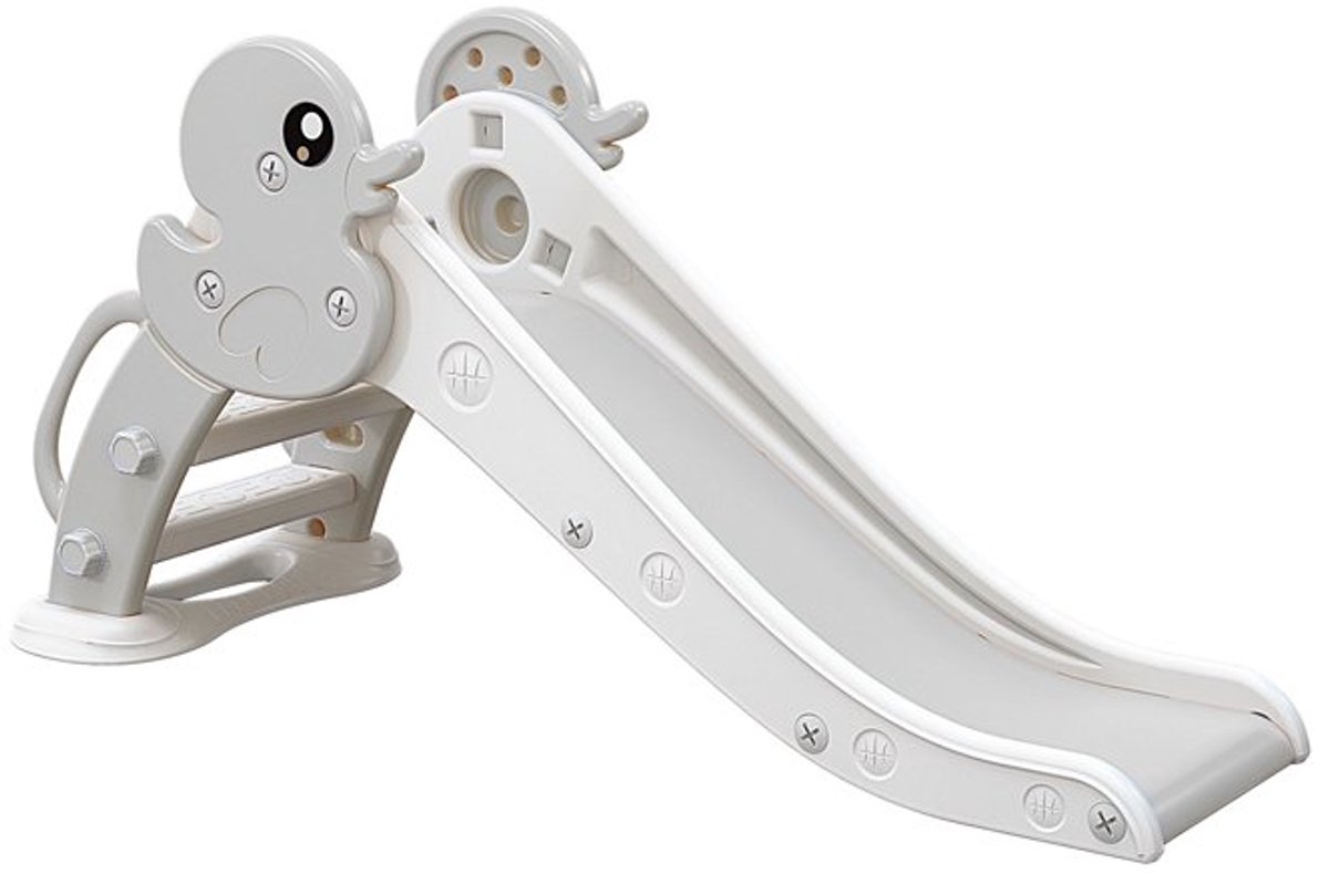 Er zijn afgeronde randen en brede treden met antislipprofiel, bedoeld om stuiptrekkingen bij kleine voeten te verminderen en stabiliteit te vergroten tijdens het klimmen. De neutrale grijs/witte kleurstelling zorgt ervoor dat de glijbaan visueel in veel interieurstijlen of tuinen past.
