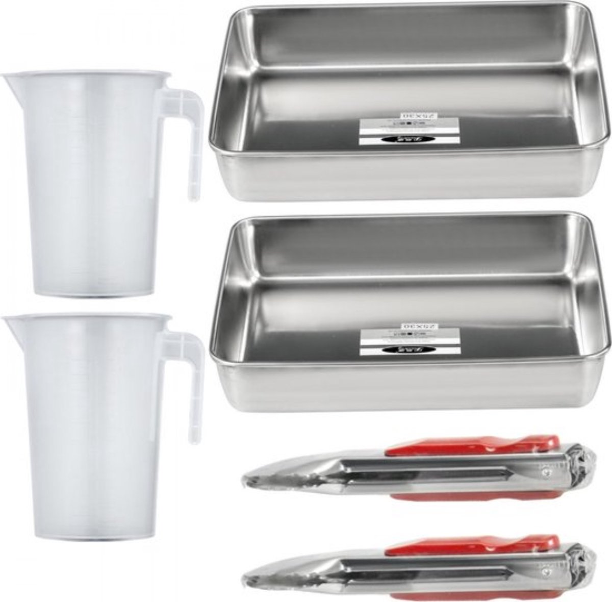 Meegeleverd zijn 2 voedselclips om veilig te hanteren, 2 maatcilinders van 2000 ml voor wegen/portioneren van deeg en 2 dienbladen voor staging na het bakken. Dat lijkt klein, maar voorkomt gehannes met geïmproviseerde tools en helpt een schone, georganiseerde werkplek te behouden.