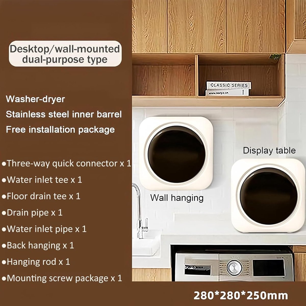 Deze compacte 2‑in‑1 wasmachine en droger is ontworpen voor kleine huishoudens, vakanties en iedereen die slim wil omgaan met ruimte. Met een bescheiden wascapaciteit van 0,3 kg en een inhoud van 3,5 liter (volgens de productvermelding) past hij moeiteloos op een tafel of aan de wand. Je schakelt eenvoudig tussen wassen en drogen en houdt via het LCD‑aanraakscherm overzicht over programma’s en resterende tijd.