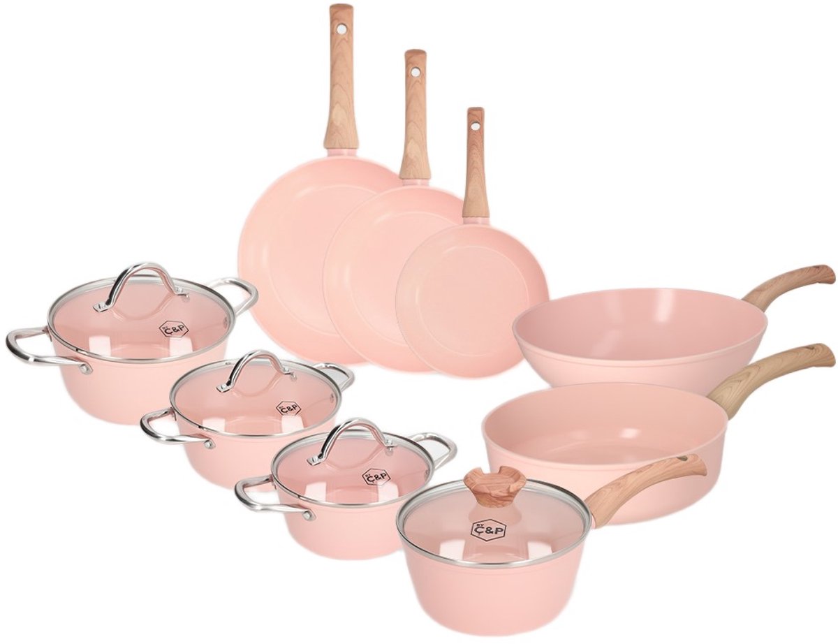 De Blush pannenset is een complete, roze 13-delige kookset met meerdere maten koekenpannen, een wok, steelpan, hapjespan en drie kookpotten met deksels. De serie is ontworpen voor dagelijks gebruik en richt zich op thuiskoks die stijl en functionaliteit willen combineren. De pannen hebben een keramische antiaanbaklaag en zijn geschikt voor alle warmtebronnen, inclusief inductie.