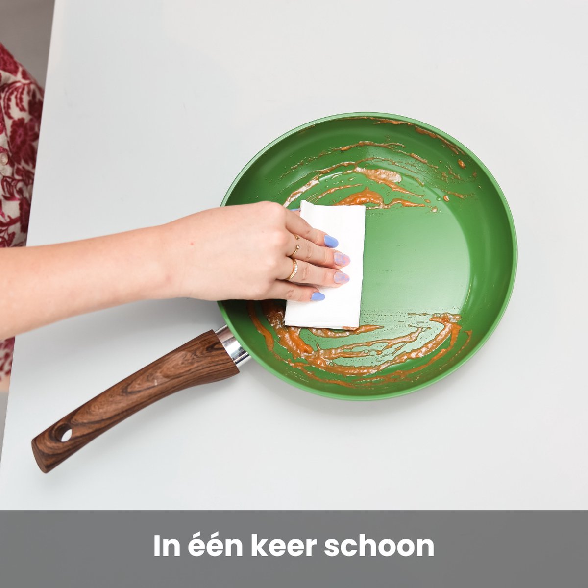 - Aangegeven is dat de pannen vaatwasserbestendig zijn, maar voor behoud van de antiaanbaklaag is afwassen met lauw water en een zachte spons aan te raden (algemene goede gewoonte).